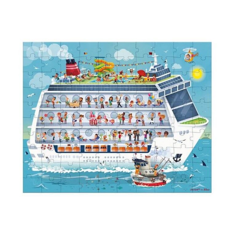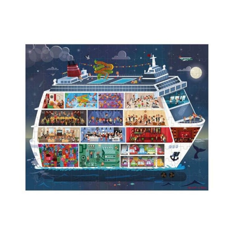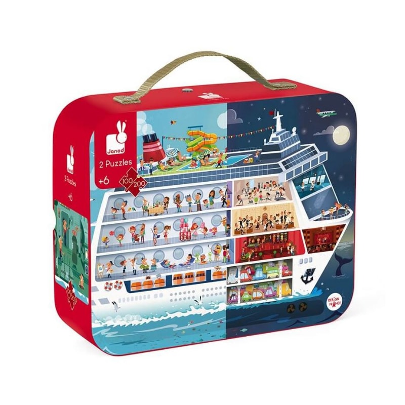 Käy kurkistamassa lystikästä menoa risteilyaluksella! Janod Risteilyalus palapelisalkku on kivaa ja kehittävää tekemistä 6+ vuotiaille lapsille. Palapelisalkku sisältää kaksi palapeliä, joista ensimmäisessä kuvataan risteilijöiden elämää päiväsaikaan (100 palaa) ja toisessa päästään ihailemaan, mitä tapahtumia yö tuo risteilyaluksella tullessaan (200 palaa). Värikäs ja hauskasti kuvitettu palapeli sisältää paljon yksityiskohtia. Upean risteilyalus-aiheisen palapelin palat säilyvät helposti näppärässä kahvallisessa salkussa.