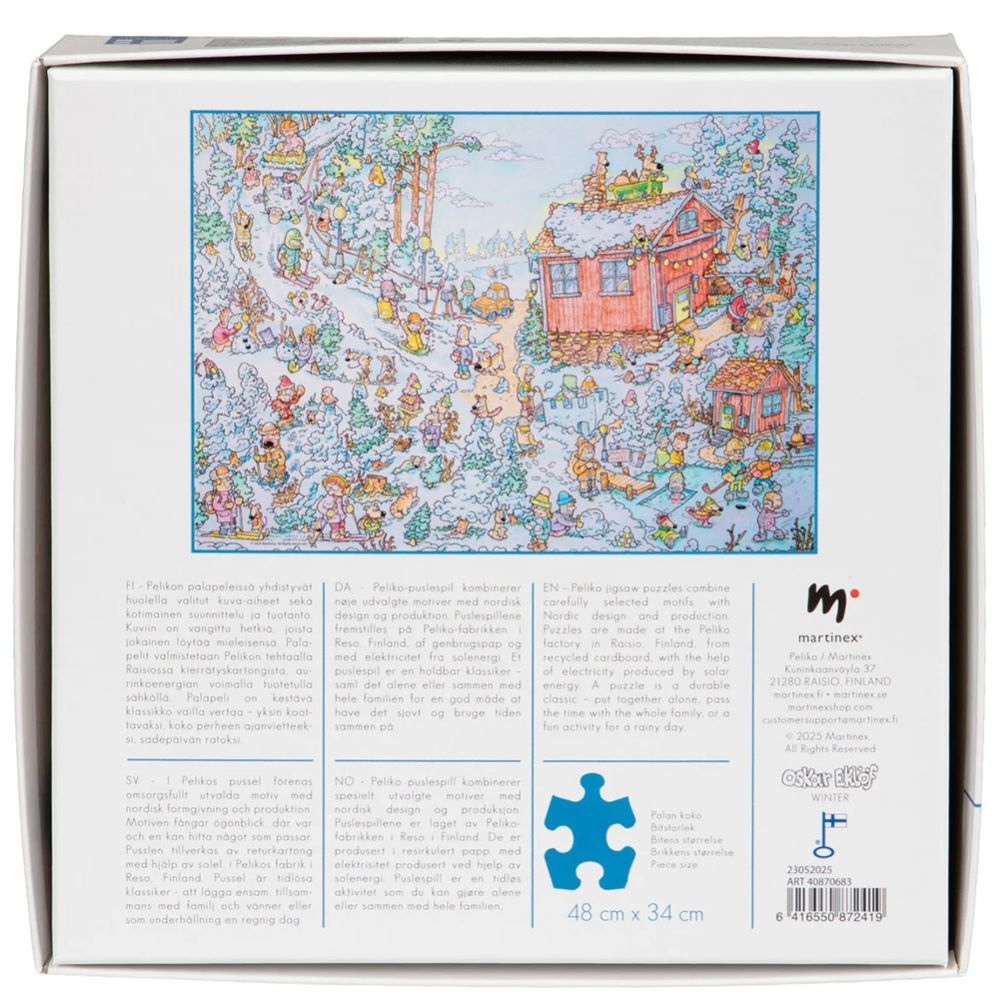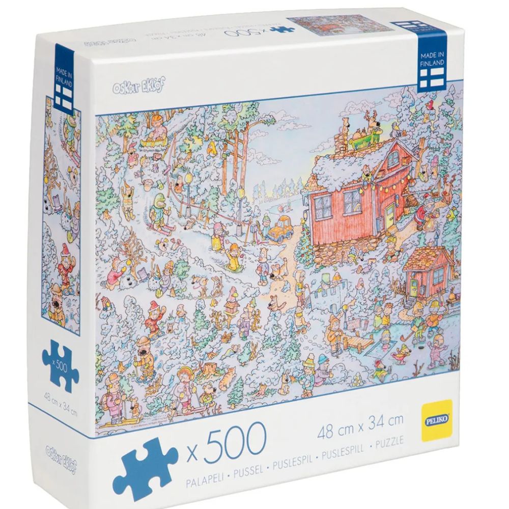 Suomalaisen kuvittajan Oskar Eklöfin piirtämä yksityiskohtia ja hassuja hahmoja pursuileva talvinen kuva. Valmiin 500 palan palapelin koko on 48 x 34 cm. Pelikon palapelit valmistetaan Suomessa kierrätyskartongista, aurinkoenergian voimalla tuotetulla sähköllä.