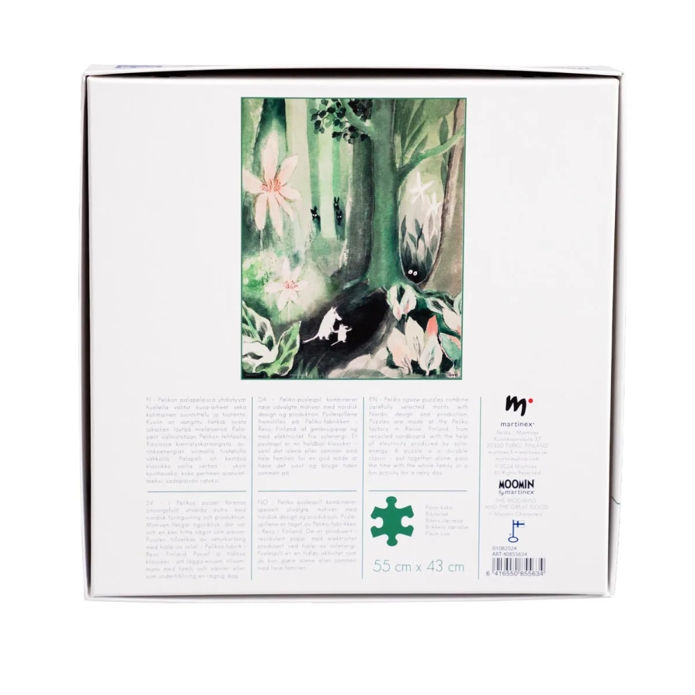 Palapelissä on ihastuttava kuva Tove Janssonin ensimmäisestä muumikirjasta: Muumit ja suuri tuhotulva. Nauti rauhallisesta hetkestä palapelin äärellä, yksin tai hyvässä seurassa.