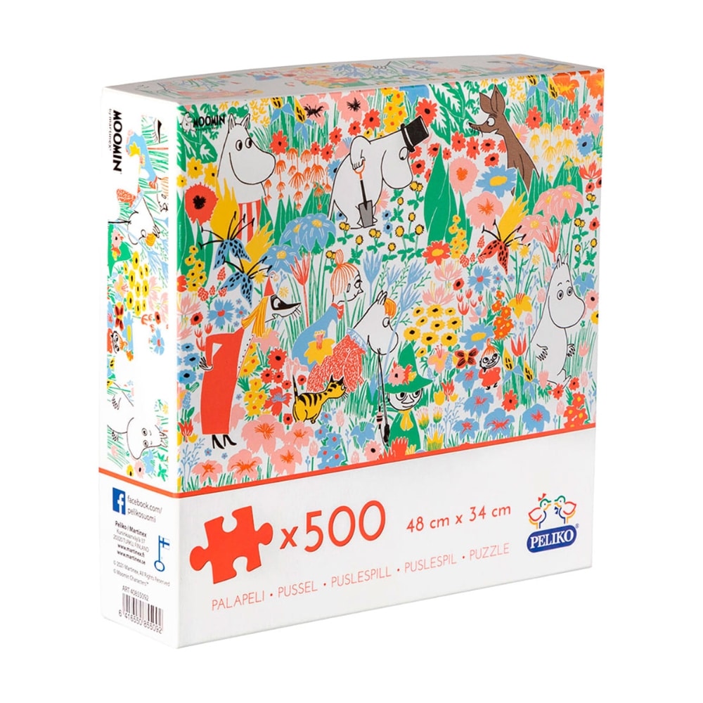 Palapeli 500 palaa Peliko Muumi – Värikäs muumiaiheinen palapeli, jossa on 500 palaa. Kuvassa Muumit ovat löytäneet upean värikkäänä hehkuvan kukkakedon. Yhden palan suuntaa-antava koko on n. 2,7 x 2,9 cm, palan muodosta riippuen. Valmiin palapelin koko on 48 x 34 cm.