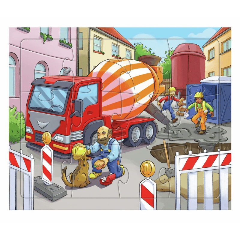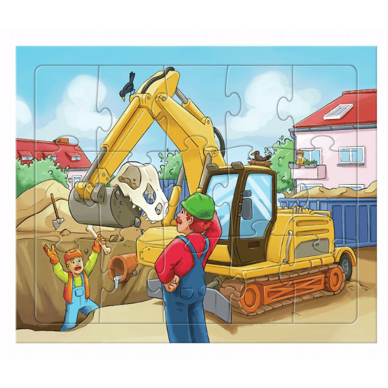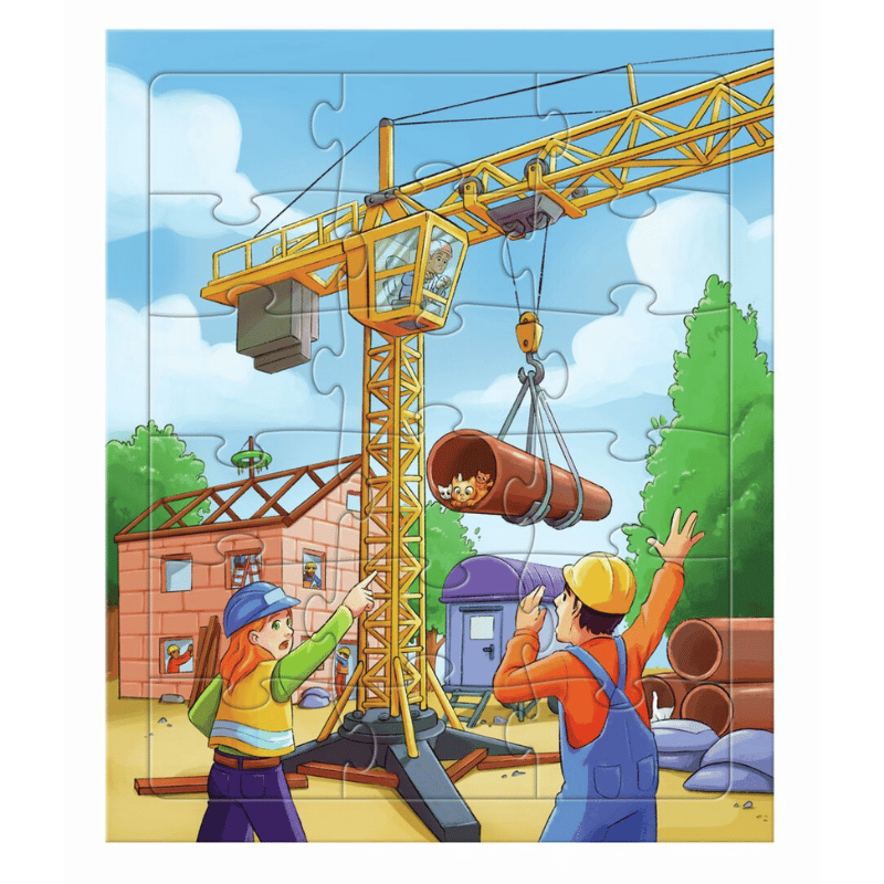 Kätevä palapelipakkaus, joka sisältää 3 erilaista työkoneaiheista palapeliä (12, 15 ja 18 palaa). Materiaali tukeva kartonki.