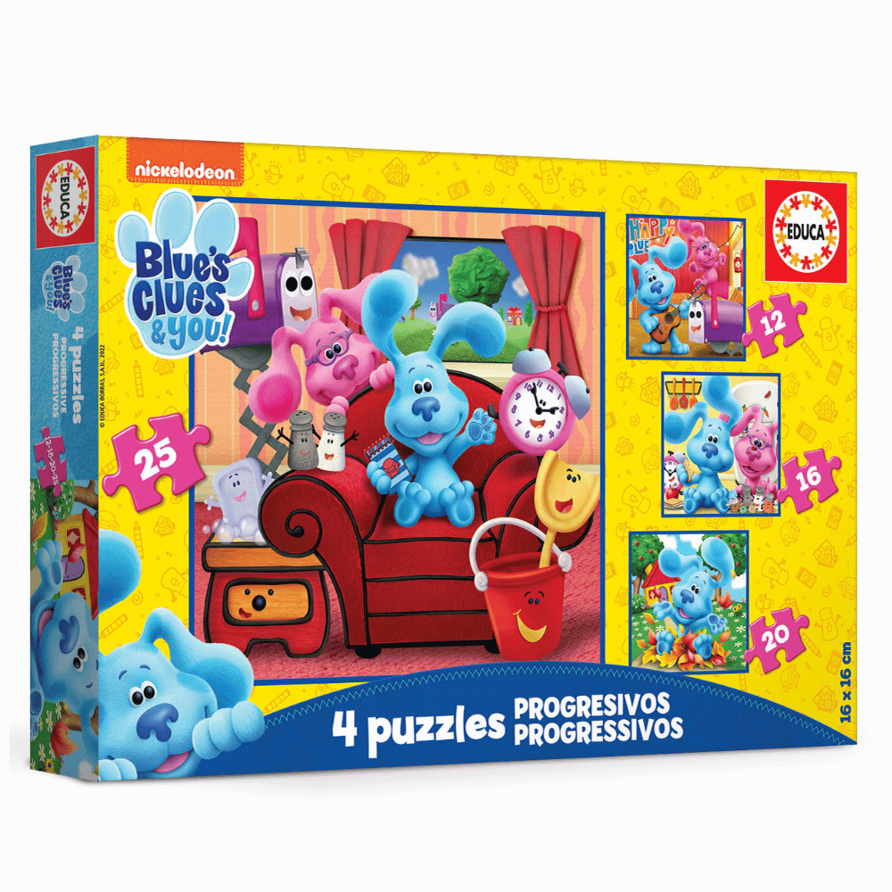 Palapeli 12-16-20-25 palaa Blue’s Clues. Uudet viehättävät palapelit liittyvät Educan® lasten palapelien kokoelmaan, hauska tapa kodin pikkuisille opetella palapelien tekoa eri vaikeusasteilla. Jokaisessa laatikossa on 4 palapeliä, joissa on eri määrä paloja (12 ja 25 välillä), jotta pojat ja tytöt uskaltavat kokeilla vaikeampia palapelejä, kun he kasvavat ja saavat harjoitusta palapelien kokoamisessa. Jokaisen kootun palapelin koko: 16 x 16 cm. 3+.