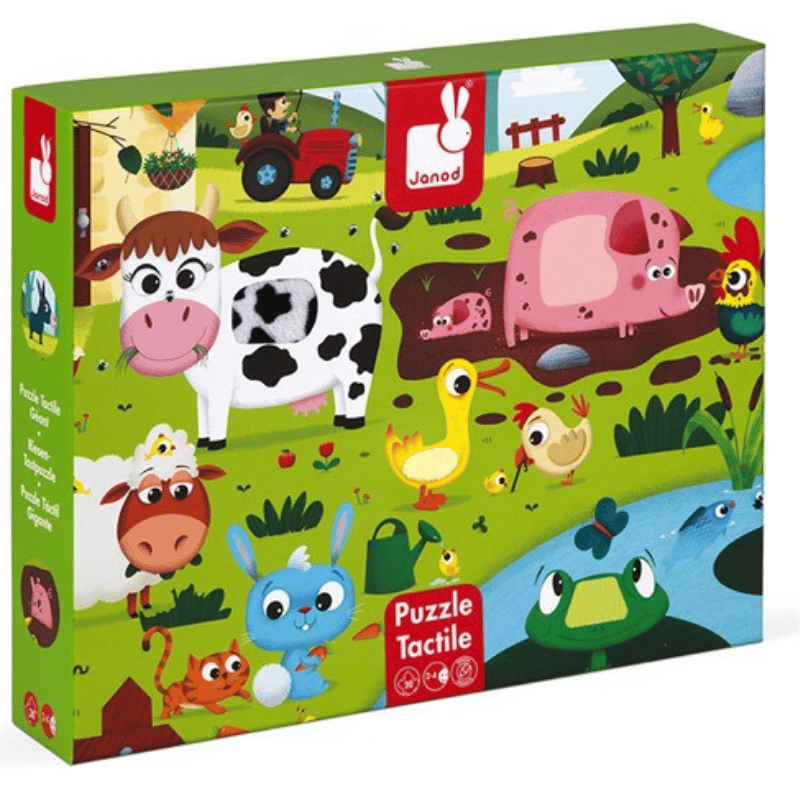 Janod Maatilan eläimet tunnustelupalapelissä on seitsemän erilaista tekstuuria, joita voit tunnustella ja tunnistaa. Hauskassa palapelissä seikkailevat tutut maatilan eläimet! Tunnistatko lehmän, lampaan, possun, kukon ja muut ystävälliset maatilan asukit? Palapelin suuriin paloihin on kiva tarttua ja niiden kokoaminen antaa kuvan hahmottamiselle sopivaa haastetta. Palapelin kokoaminen on hauskaa puuhaa ja samalla harjaantuvat motoriset taidot, hahmottaminen ja tuntoaisti.