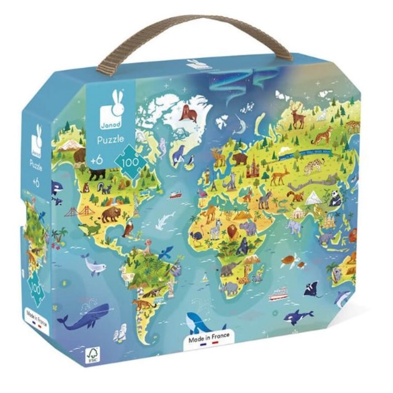 Janod Maailmankartta palapelisalkku sisältää upean 100 palan karttapalapelin, joka on täynnä upeita yksityiskohtia ja paljon tutkittavaa!