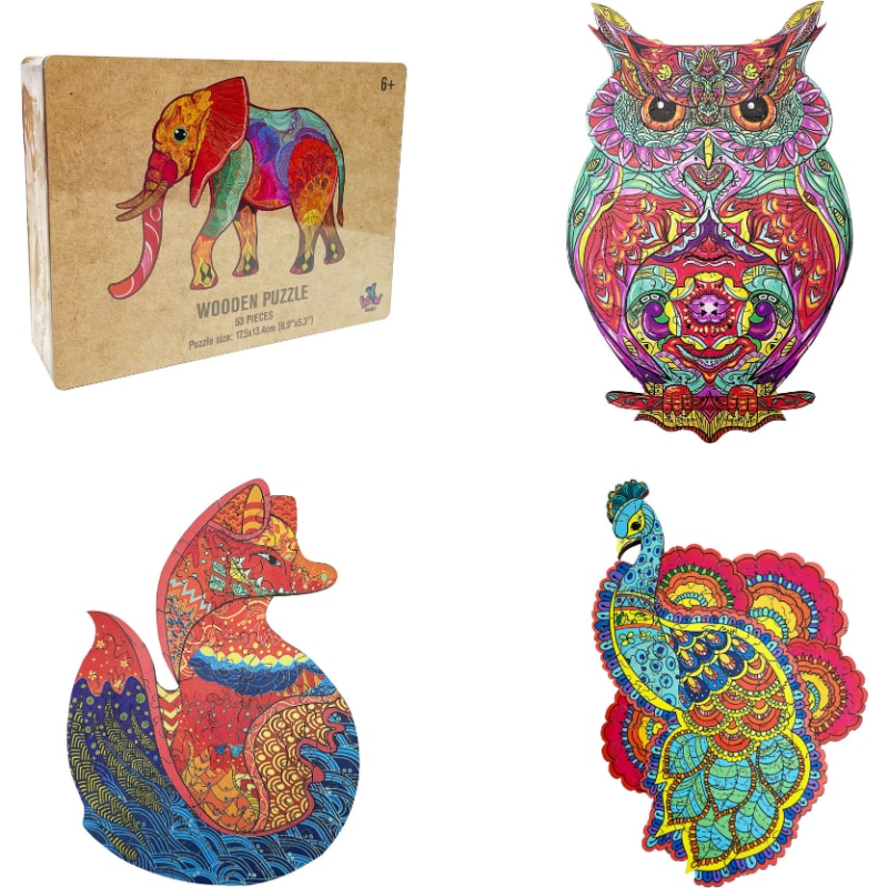 Upea, värikäs ja kaunis eläinaiheinen puupalapeli, jonka jokainen pala on eri muotoinen! Valmiin palapelin voi laminoida ja asettaa näytille mukana tulevien jalkojen avulla. Palapelit ovat valmisttu 100 %:sti vastuullisesti tuotetusta puusta, FSC-sertifioitua materiaalia. Lajitelmassa on neljä erilaista eläin palapeliä: pöllö, norsu, kettu ja fasaani.