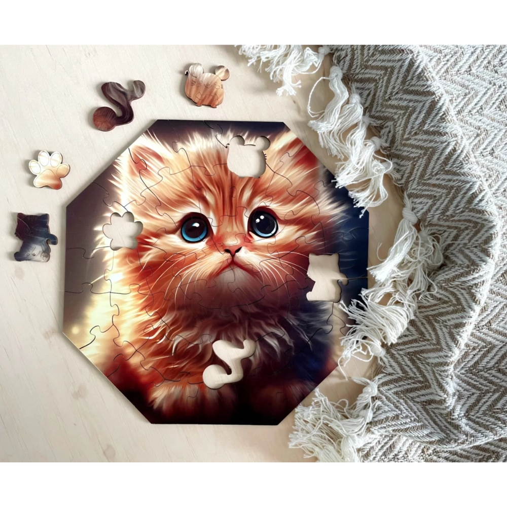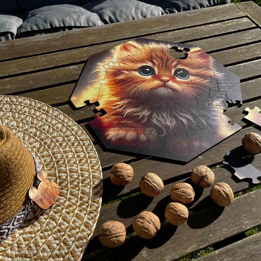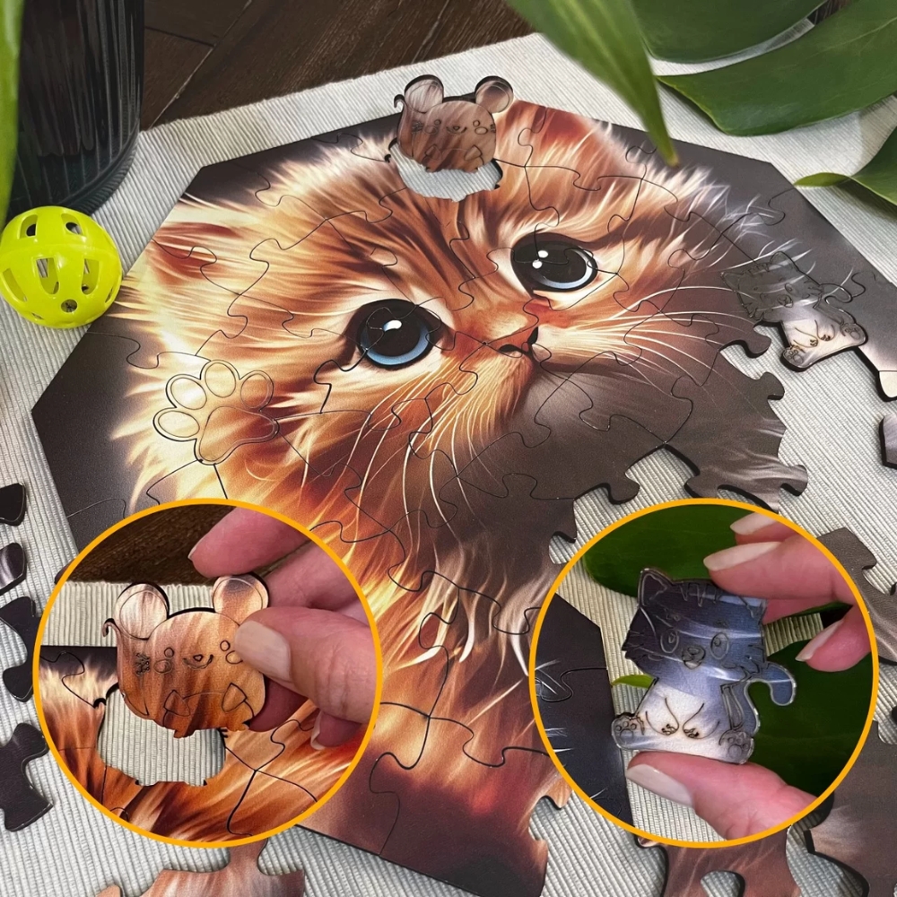 Tämä puupalapeli on ihana lahja lapsille, jotka pitävät kissoista. Palapeliin on piilotettu erikoispaloja: eläimiä, kasveja ja esineitä. Löydä ne kaikki!
