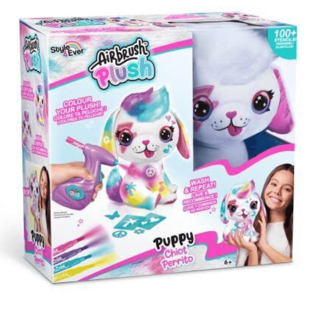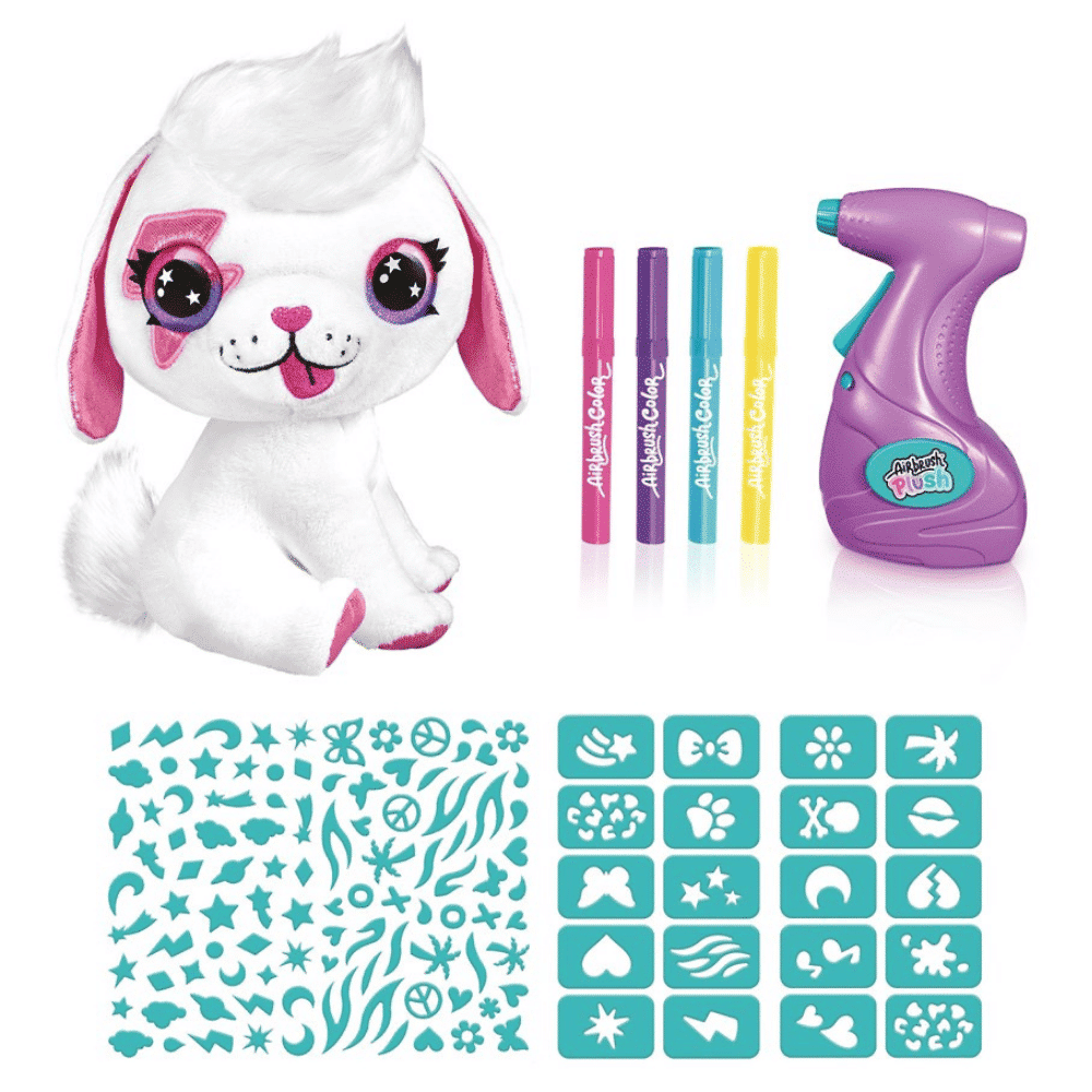 Suunnittele ja luo oma monivärinen pehmolelu paristokäyttöisellä väriruiskuttimella. Ruiskuta haluamiasi värejä Airbrush Plush koiranpentu leluun ja käytä sapluunoita apunasi, jolloin saat erilaisia kuvioita. Kun haluat pehmolelustasi toisen värisen, pese se ensin puhtaaksi vedellä ja värjää se sitten uudestaan. Koiranpennusta tulee niin tyylikäs ja trendikäs kuin vain itse haluat! Käytä luovuuttasi ja aloita värjääminen. Valkoisella pehmolelulla on karvaa päässä ja hännässä, suloiset kasvot ja isot tähtisilmät. Upea ja luova lahja yli 6-vuotiaille lapsille!