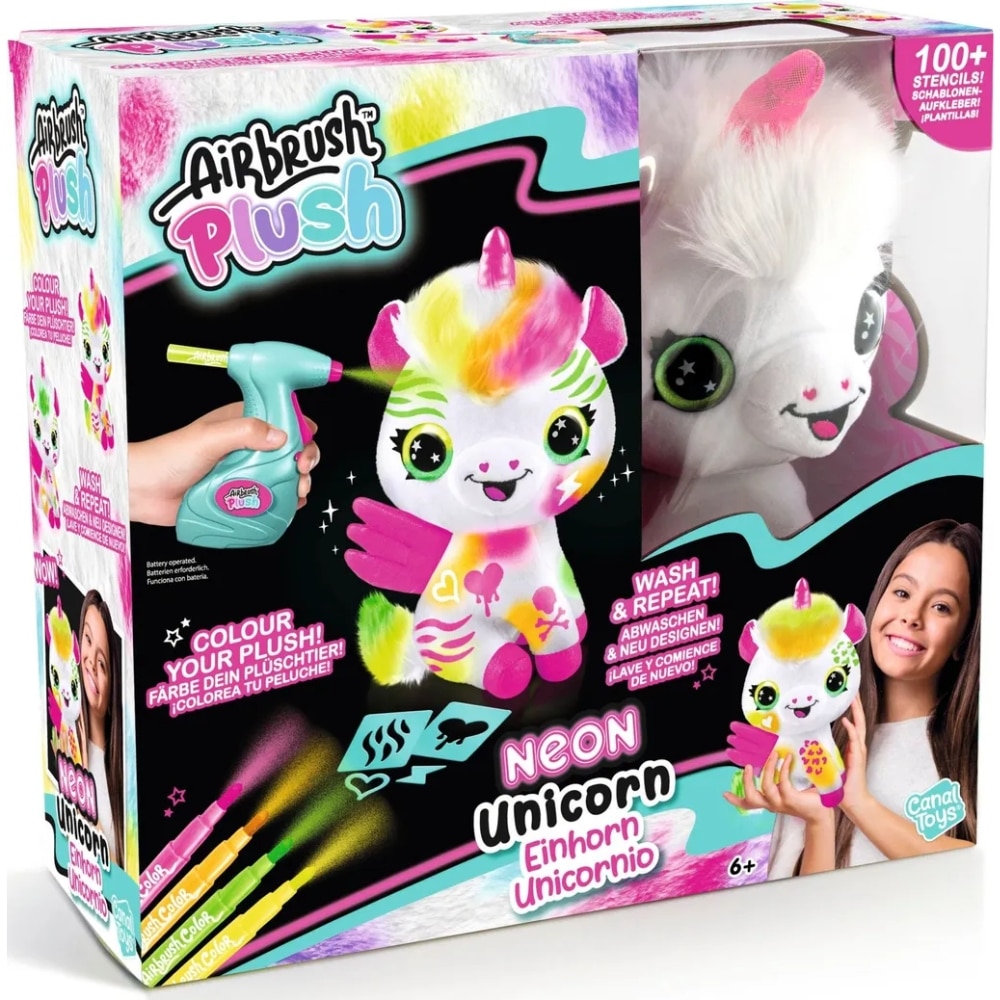 Airbrush Plush Neon pehmolelu yksisarvinen – Paketissa on pehmolelu ja tarvikkeet sen värjäämiseen ilmasiveltimellä. Päästä luovuutesi valloilleen ja toteuta juuri sen näköinen yksisarvinen kuin haluat! Värit ovat vesiliukoisia, joten pehmolelu voidaan pestä ja värjätä uudelleen useita kertoja.