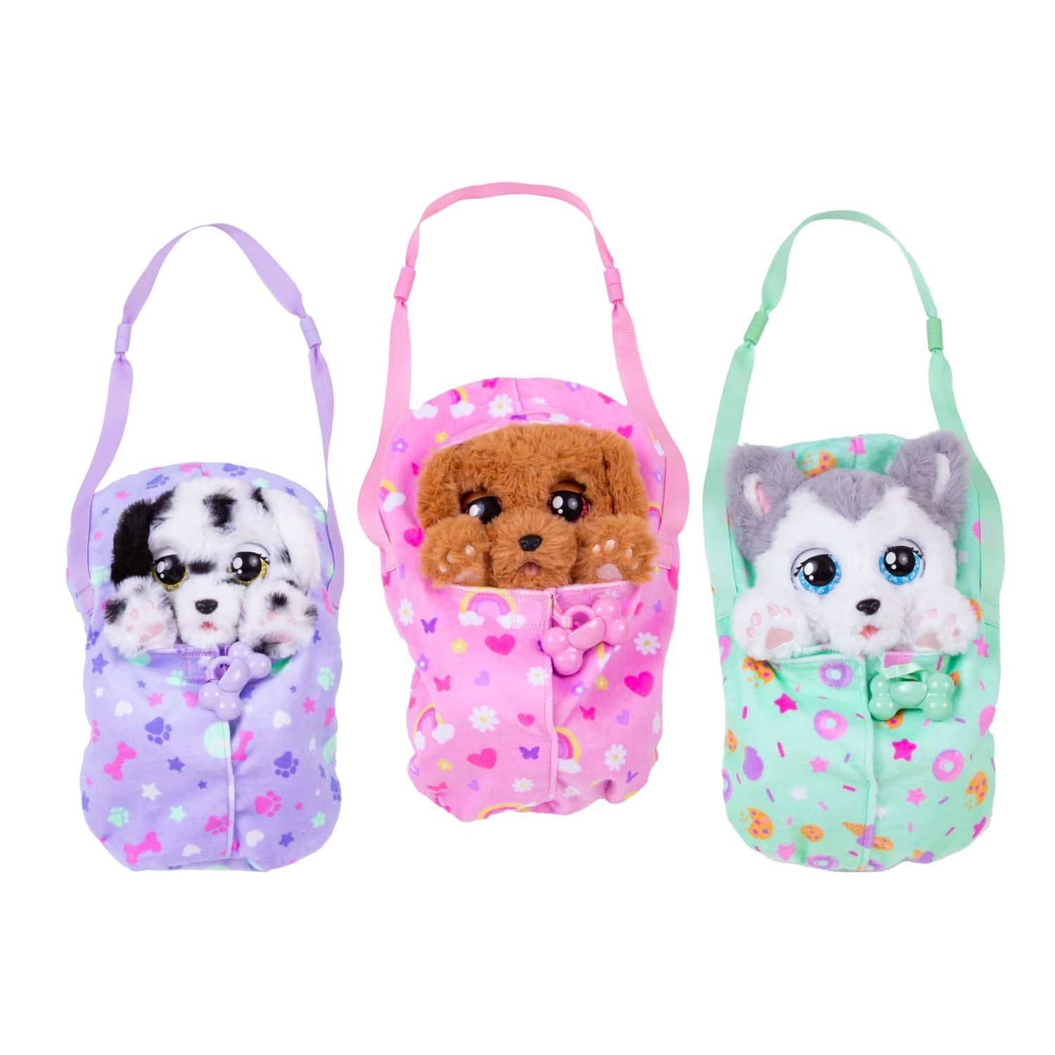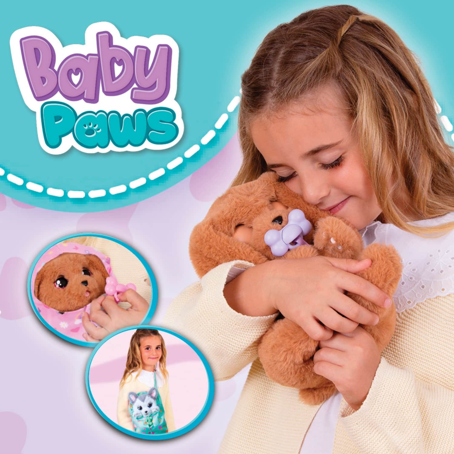 Baby Paws koira pehmolelu erilaisia – Suloisen pehmeä koiranpentu nukkuu viltin sisällä, joka on myös kantolaukku. Poista pennun tutti niin se avaa silmänsä ja haukahtaa. Pehmolelu painaa kuten oikea koiranpentu. Koko 20 cm. Sis. paristot 2 x AAA. Useita erilaisia. 18 kk+