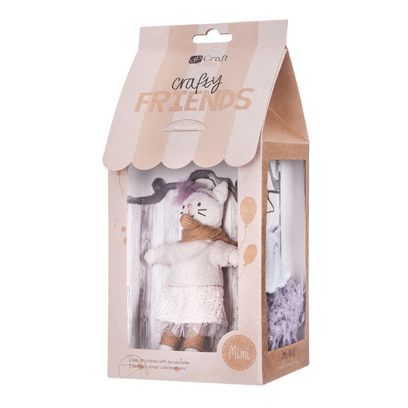 Crafty Friend Mimi-kissa kahdella vaihtovaatekerralla ja asusteilla. Olen Mimi-kissa, tunnettu mielenkiintoisista tarinoistani joita kerron radiossa kylämme asukkaille. Eniten pidän yhteisen ajan järjestämisestä ystävieni kesken; minulla onkin aina paljon hyviä, turvallisia ideoita yhteiseen hauskanpitoon! Olen huolehtiva ja energinen ystävä. Eiköhän keksitä jotain hauskaa tekemistä yhdessä?