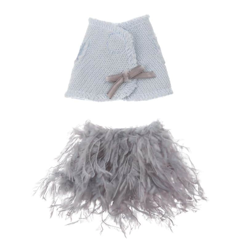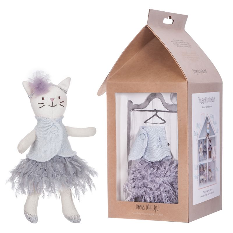 Sopii koristeeksi, nukkekotiin tai leikkimiseen! Kissapehmolelulla on neulotut ja itsetehdyltä näyttävät vaatteet.