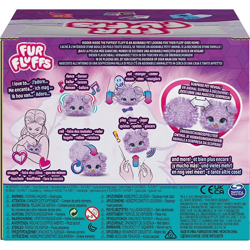 Fur Fluffs interaktiivinen lemmikki pehmolelu etsii pysyvää kotia. Super söpössä leluissa on yli 100 jännittävää ääntä ja reaktiota ja lemmikin paljastus yllätys. Piilossa pehmeän vaaleanpunaisen pörröpallon sisällä on Purr ’n Fluff. Voita ujon ja pelokkaan pehmon luottamus leikkimällä Fur Fluff-lelusi kanssa rohkaistaksesi häntä tulemaan pois piilostaan karvojensa seasta. Voit silittää, pyörittää, heiluttaa, heittää ja kääntää hänet ylösalaisin. Kun pörröpallostasi tuntuu turvallisemmalta, hän paljastaa korvansa. Jatka leikkiä ja hänen silmänsä kurkistavat esiin. Kun Purr ’n Fluff luottaa sinuun täysin, kuulet juhlalaulun ja hän muuntautuu pörröpallosta lemmikiksi. Leikkimällä vapautat Purr ’n Fluffin suloisen ja hupsun persoonallisuuden.