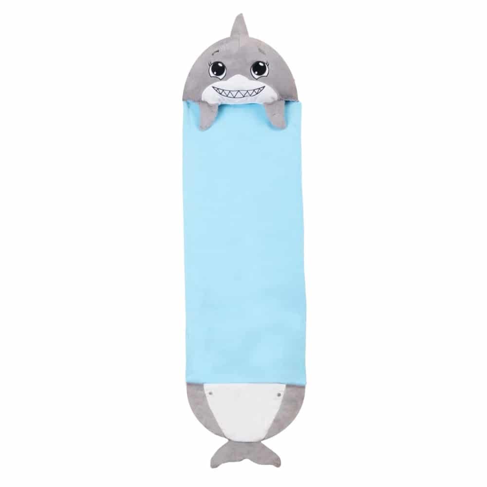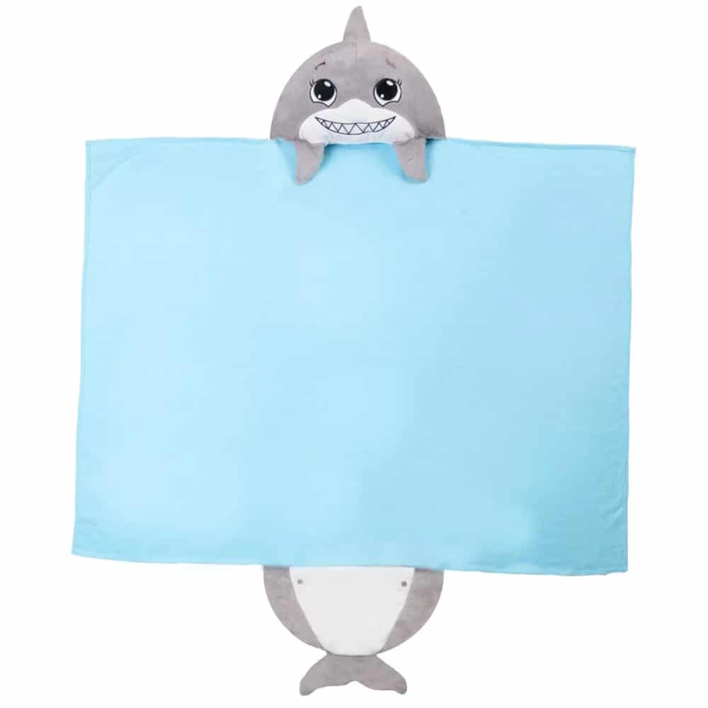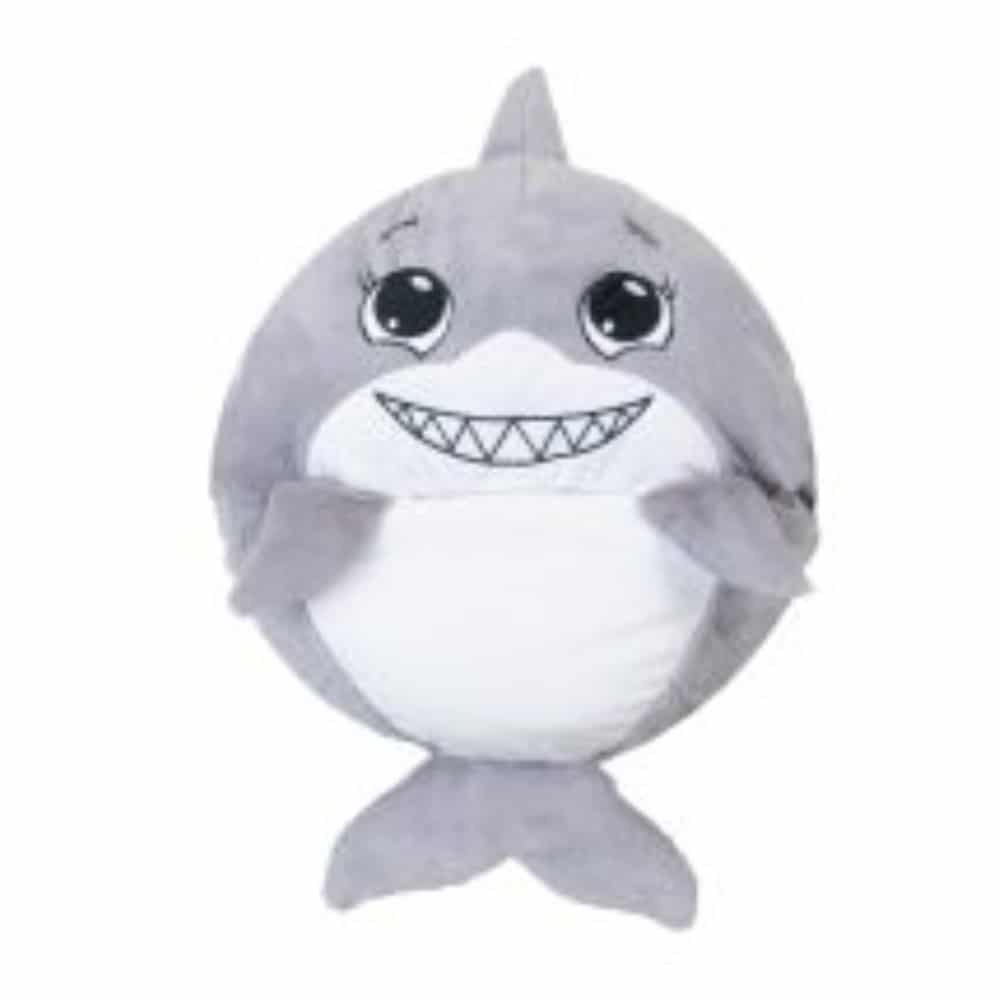 Happy nappers hai tyyny/huopa – Suloinen ja samettisen pehmeä M-kokoinen hai-eläinpehmotyyny, jonka sisältä avautuu ihanan pehmeä huopa. Harmaan, pyöreän tyynyn päällä on iloiset hain kasvot, ja siihen on ommeltu myös evät ja pyrstö. M-koon huopa sopii n. 3-vuotiaalle tai sitä vanhemmalle lapselle, ja sen koko avattuna on n. 100 x 125 cm. Tyynyssä on vetoketjullinen säilytystasku, ja huovan alareunaan jäävässä pussukassa voi lämmitellä vaikka varpaita. Pehmotyynyksi, päiväunille, yökyläreissuille, telttaan!