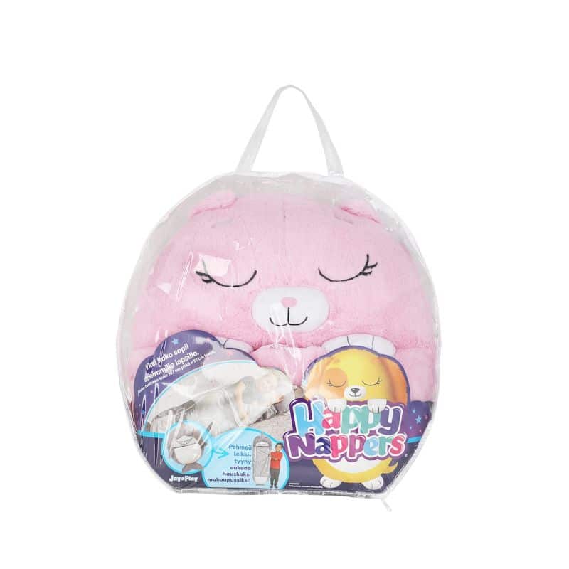 Yökyläilyt ja telttaretket ovat ihania, ja jo aivan pienet lapset voivat nauttia niistä. Yökylässä saattaa välillä tulla ikävä, ja silloin kotoa tuotu oma tyyny tai omat petivaatteet saattavat helpottaa. Happy Nappers -eläinpehmotyyny on ihanan tuttu jo kotoa omasta huoneesta, ja se tuo lohtua kyläreissuilla. Makuupussina tämä pitää lapsen olon lämpimänä ja mukavana, tyynynä käytettynä tämä on ihastuttavan pehmeä halailua ja nojailua varten sekä pään alle. Kokonaisuus on helppo ja näppärä käyttää ja kuljettaa mukana.