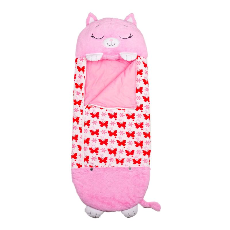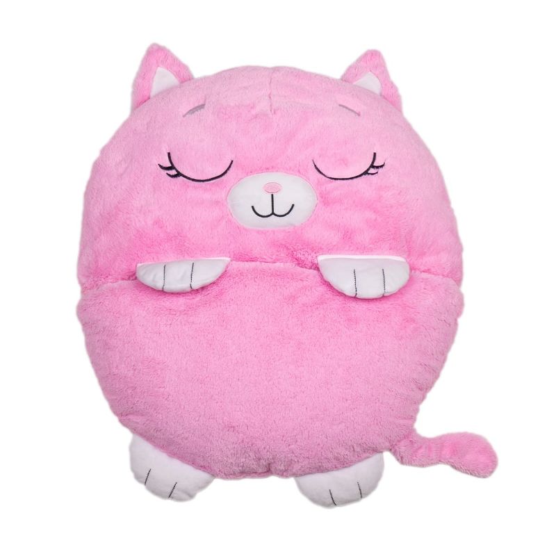 Suloinen ja samettisen pehmeä S-kokoinen kissa-eläinpehmotyyny, joka avautuu 140 cm pituiseksi makuupussiksi. Vaaleanpunaisen, pyöreän tyynyn päällä on hellyttävät kissan kasvot, ja siihen on ommeltu myös kaikki sen tassut, häntä ja korvat. S-koon makuupussi sopii n. 2-4 -vuotiaalle lapselle, ja sen koko on n. 45 x 42 cm. Pehmotyynyksi, päiväunille, yökyläreissuille, telttaan!
