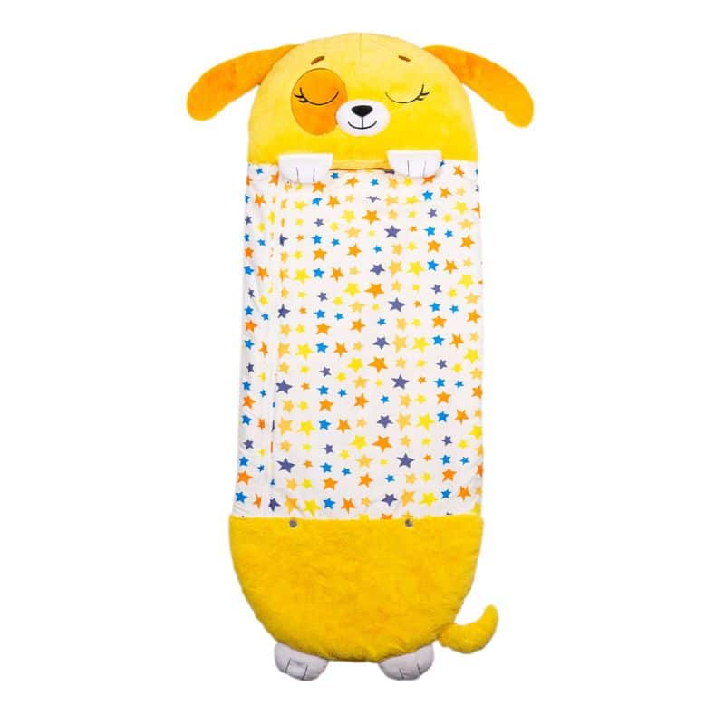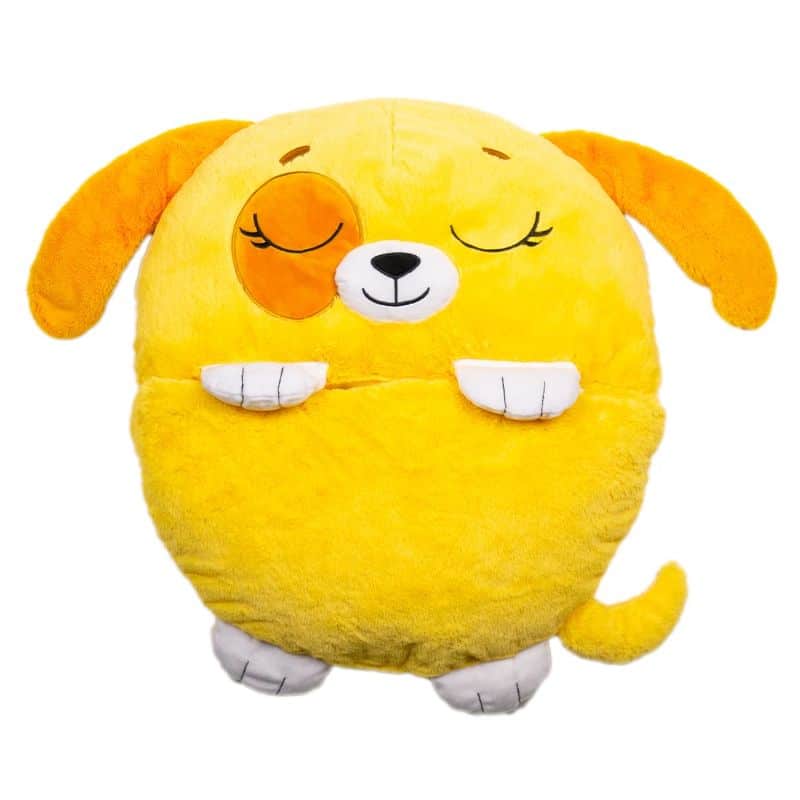 Suloinen ja samettisen pehmeä S-kokoinen koira-eläinpehmotyyny, joka avautuu 140 cm pituiseksi makuupussiksi. Keltaisen, pyöreän tyynyn päällä on hellyttävät koiran kasvot, ja siihen on ommeltu myös sen tassut, häntä ja korva. Sopii noin 2-4 -vuotiaalle lapselle, ja sen koko on noin 45 x 42 cm. Pehmotyynyksi, päiväunille, yökyläreissuille, telttaan!