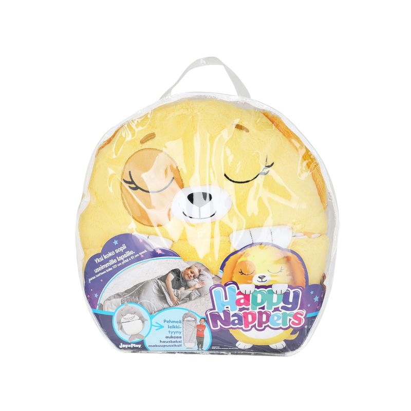 Yökyläilyt ja telttaretket ovat ihania, ja jo aivan pienet lapset voivat nauttia niistä. Yökylässä saattaa välillä tulla ikävä, ja silloin kotoa tuotu oma tyyny tai omat petivaatteet saattavat helpottaa. Happy Nappers -eläinpehmotyyny on ihanan tuttu jo kotoa omasta huoneesta, ja se tuo lohtua kyläreissuilla. Makuupussina tämä pitää lapsen olon lämpimänä ja mukavana, tyynynä käytettynä tämä on ihastuttavan pehmeä halailua ja nojailua varten sekä pään alle. Kokonaisuus on helppo ja näppärä käyttää ja kuljettaa mukana.