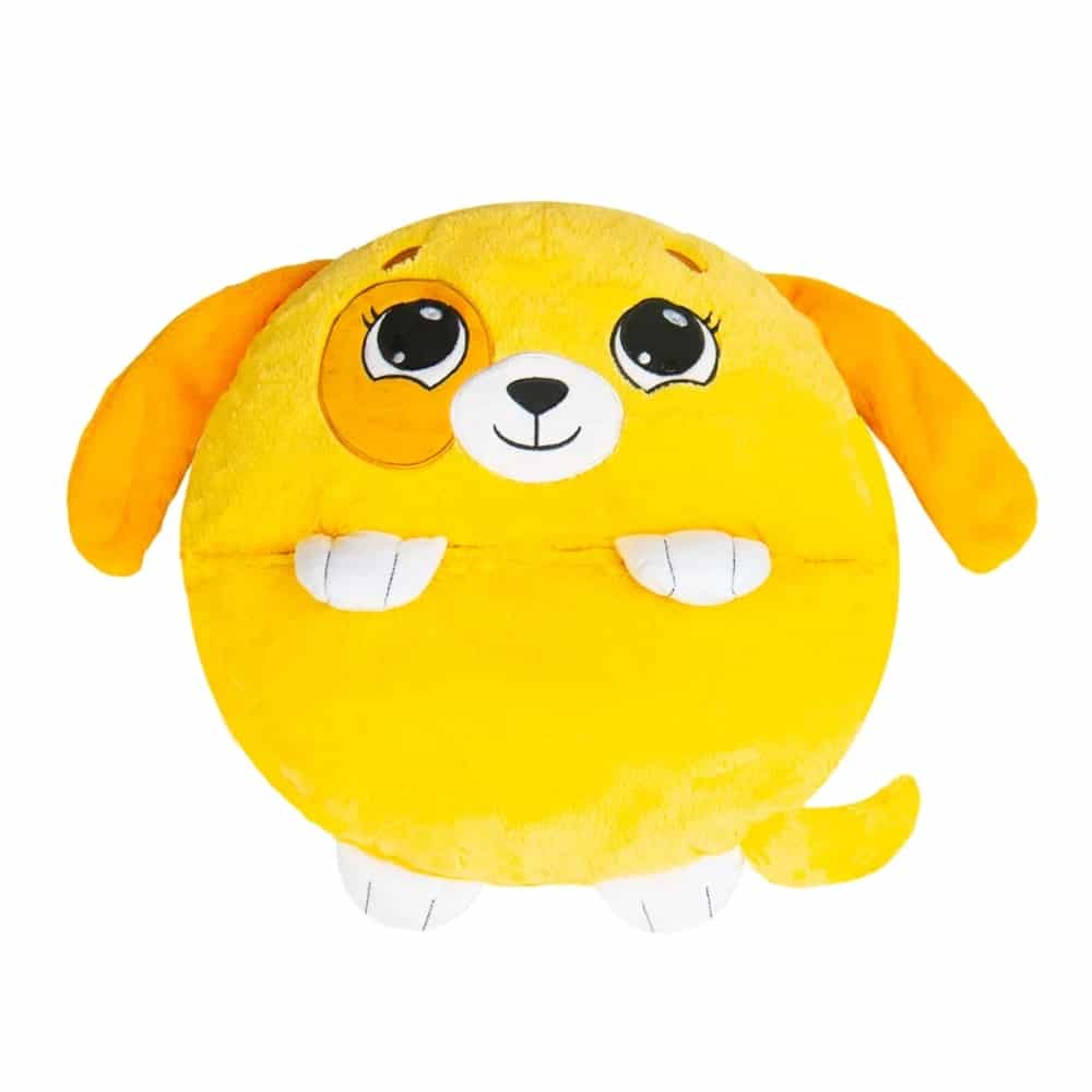Suloisen ja samettisen pehmeän M-kokoisen koira-eläinpehmotyynyn sisältä avautuu ihanan pehmeä huopa. Keltaisen, pyöreän tyynyn päällä on suloiset koiran kasvot, ja siihen on ommeltu myös tassut, korvat ja häntä. M-koon huopa sopii n. 3-vuotiaalle tai sitä vanhemmalle lapselle, ja sen koko avattuna on n. 100 x 125 cm. Tyynyssä on vetoketjullinen säilytystasku, ja huovan alareunaan jäävässä pussukassa voi lämmitellä vaikka varpaita. Pehmotyynyksi, päiväunille, yökyläreissuille, telttaan!