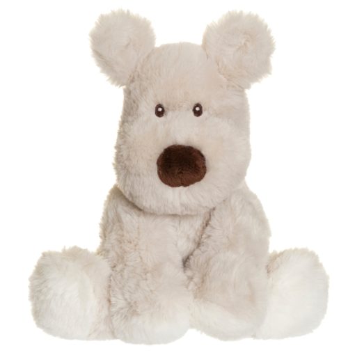 Laadukas pehmolelukoira on pehmoinen ja sillä on niin silkinpehmeä turkki, että sen haluaa ottaa mukaansa kaikkialle. Koiralla on ruskea kuono ja kirjaillut silmät.