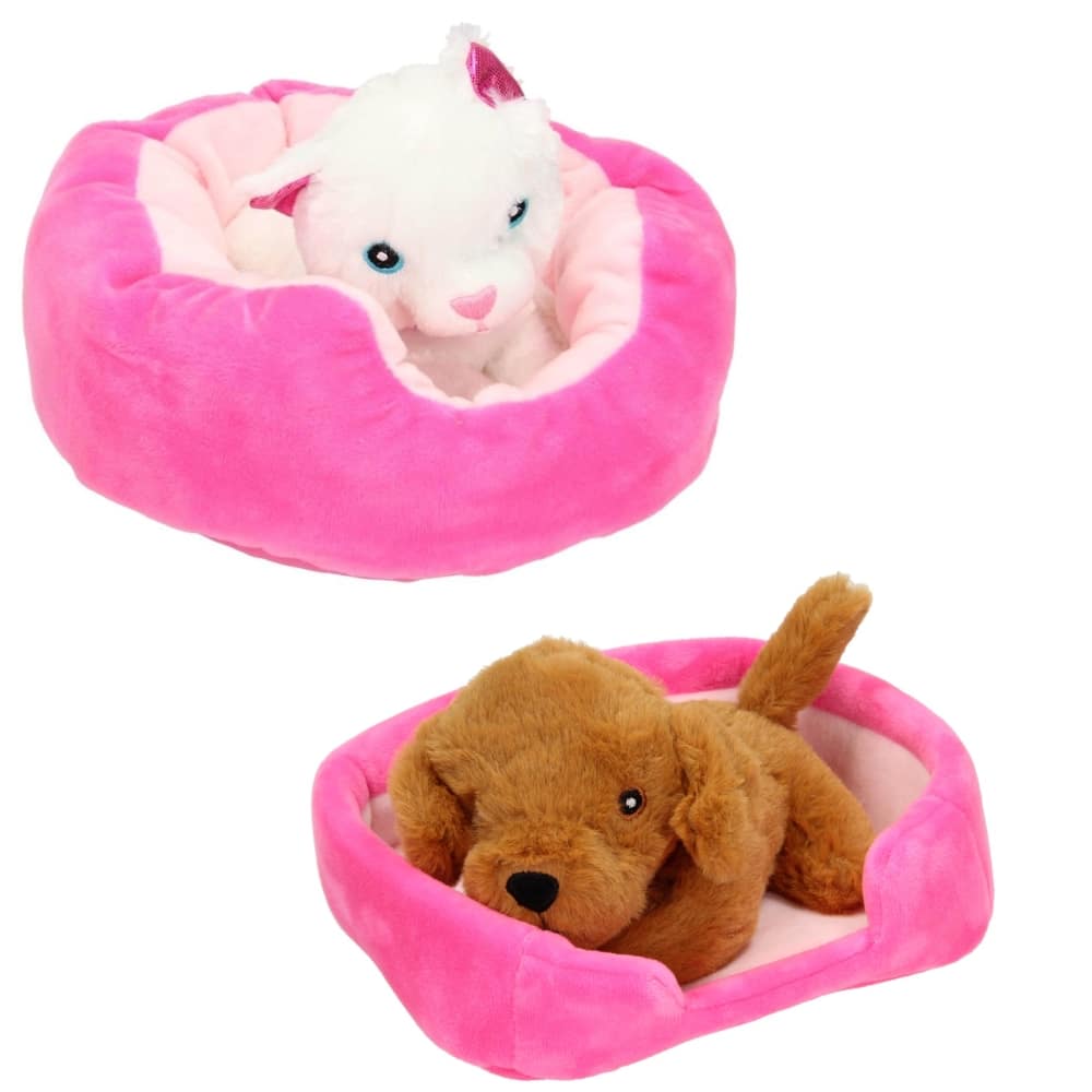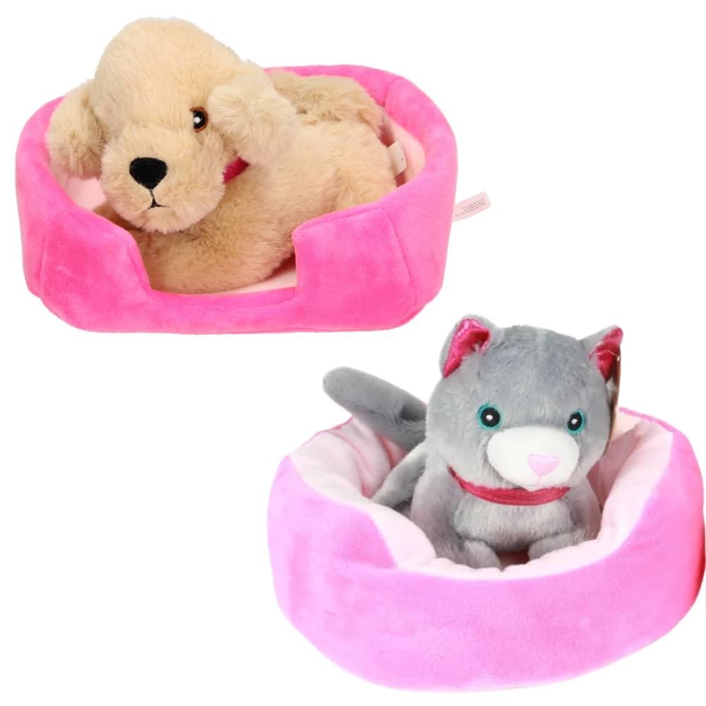 Koira tai kissa pehmolelu pedissä erilaisia on suloinen lemmikki pehmeässä pedissä. Pehmoilla on turvalliset ommellut silmät ja kissoilla pinkit korvat ja kaulapannat. Pehmolelu on ekologinen valinta, sillä se on tehty muovipulloista. Lajitelmassa on valkoinen ja harmaa kissa sekä ruskea ja vaalea koira pinkissä pedissä. Ikäsuositus: 2+ vuotta. Käsinpesu