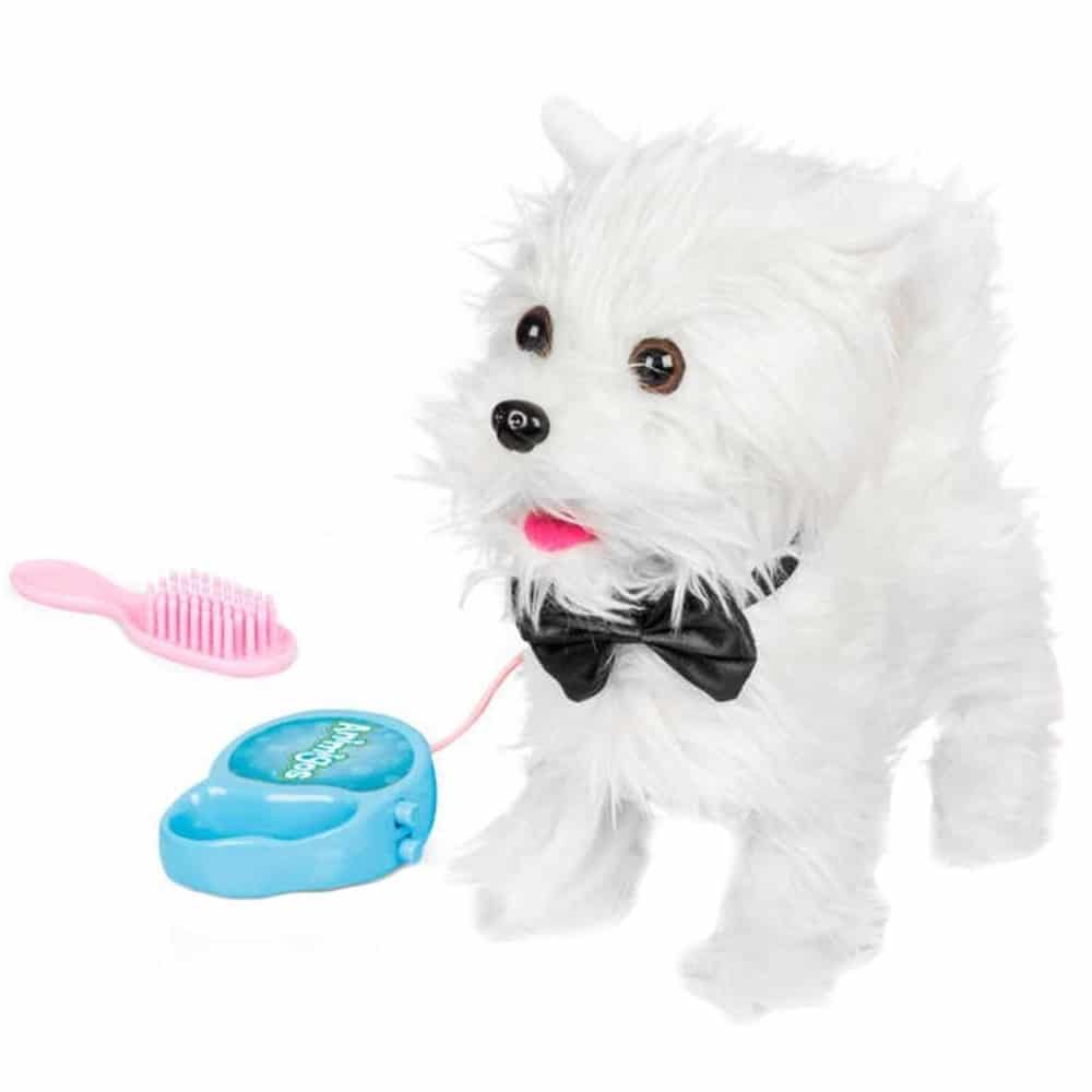 Suloinen koira Westie kävelevä Animigos kulkee eteenpäin ja heiluttaa häntäänsä hihnassa olevan ohjaimen avulla. Mukana tulee myös harja koiran valkoisen turkin harjaamista varten. Lapset rakastavat pitää hyvää huolta kauko-ohjattavasta koirasta! Lelu sopii yli puolitoista vuotiaalle lapselle.