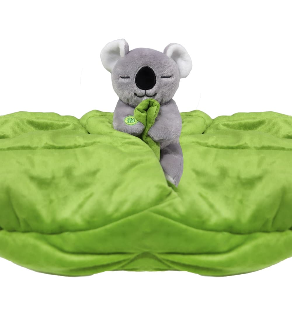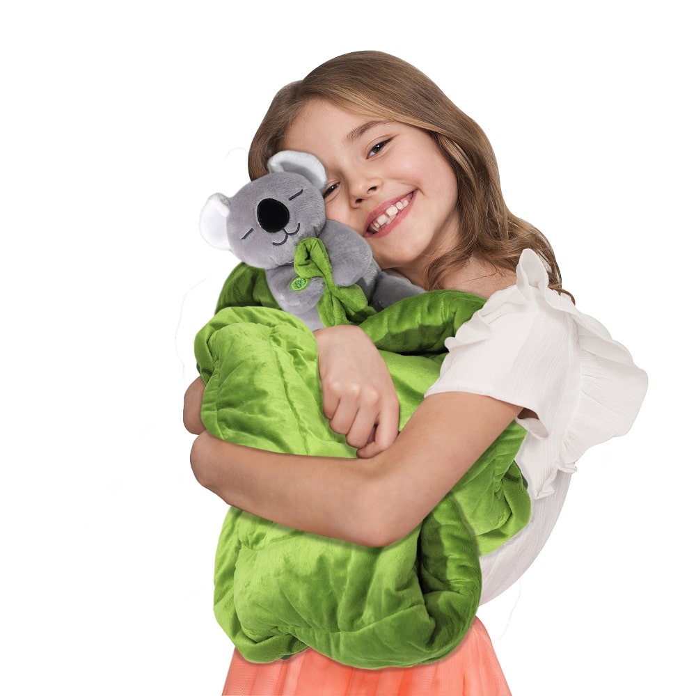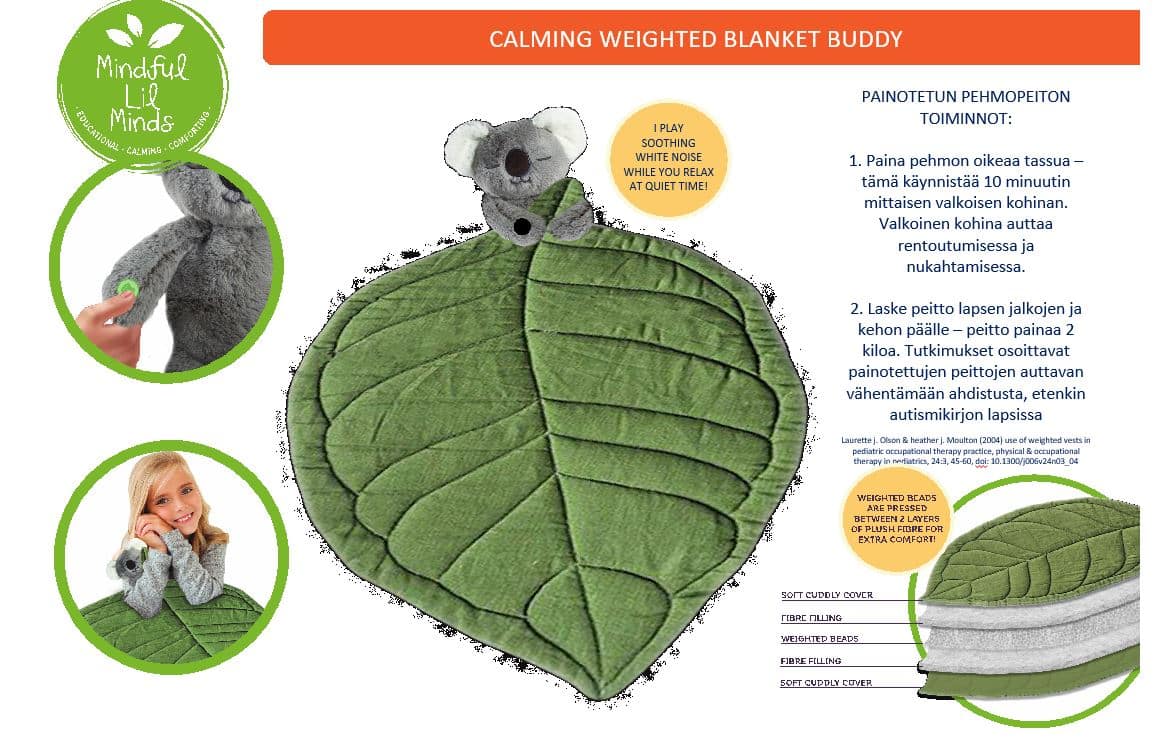 Rauhoittava ja pehmeä Koala painopeitto lapselle. Paina Koala pehmon oikeaa tassua ja rauhoittava kohinaa alkaa kuulua.Tämä kohina auttaa rentoutumisessa ja nukahtamisessa. Kun asetat painopeiton lapsen jalkojen ja kehon päälle se auttaa stressin, ahdistuksen ja kiukun lievittämiseen.Tutkimukset osoittavat painopeittojen auttavan vähentämään ahdistusta, etenkin autismikirjon lapsissa. Vuoden 2022 innovaatiolelu finaalisti.