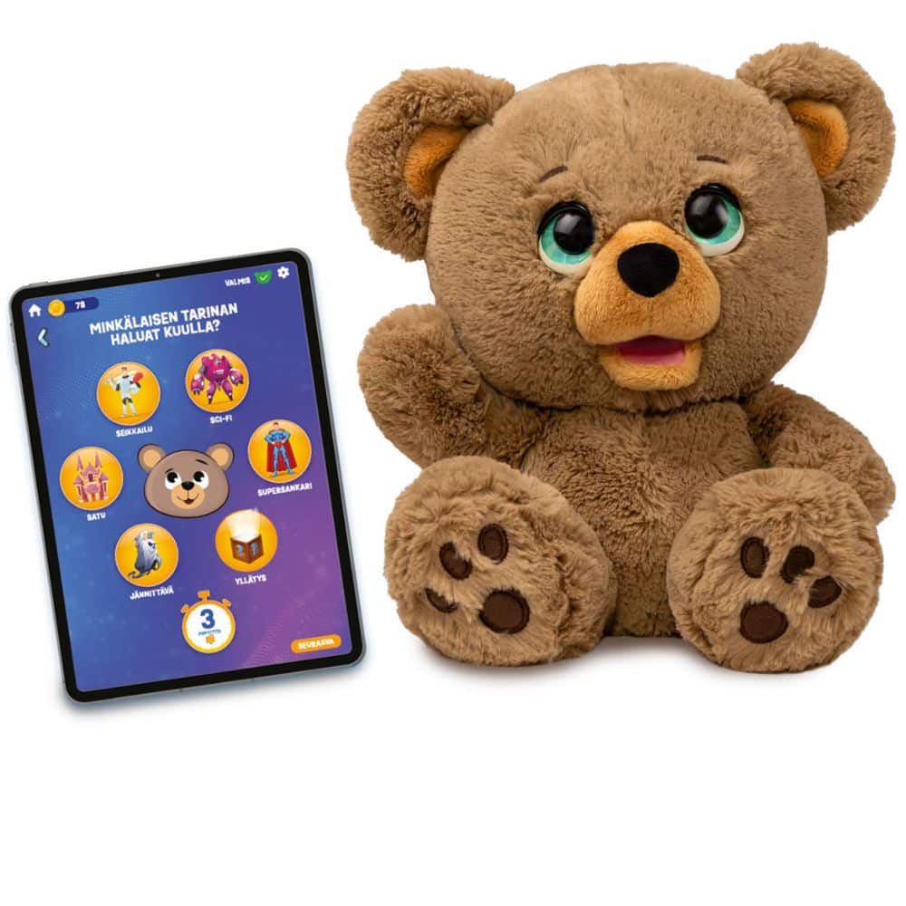 Play-I Poe -nalle keksii tarinoita tekoälyn avulla! Se luo tarinoita antamistasi aiheista ja keksii hauskoja vitsejä ja arvoituksia. Voit tallentaa 60 minuuttia tarinoita. Tarinoiden luomiseen tarvitaan ilmainen sovellus.