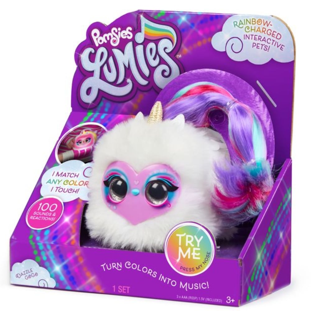Pomsies Lumies pehmolelu liila on maaginen yksisarvinen pörröpehmolelu, joka rakastaa värejä ja musiikkia. Lumies vaihtaa väriään sen mukaan, mihin se koskee. Interaktiivinen pehmolelu reagoi myös väreihin erilaisilla rytmeillä, äänillä ja musiikilla.