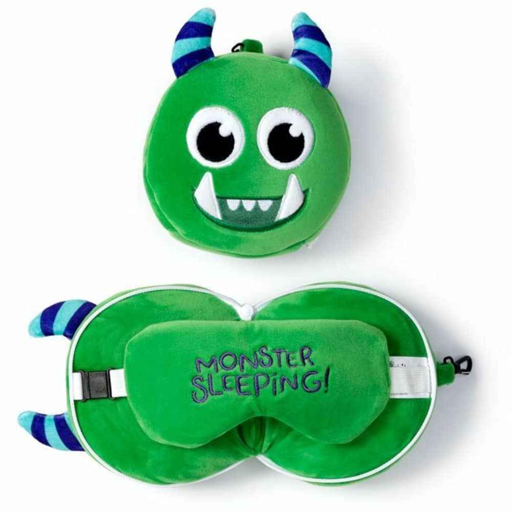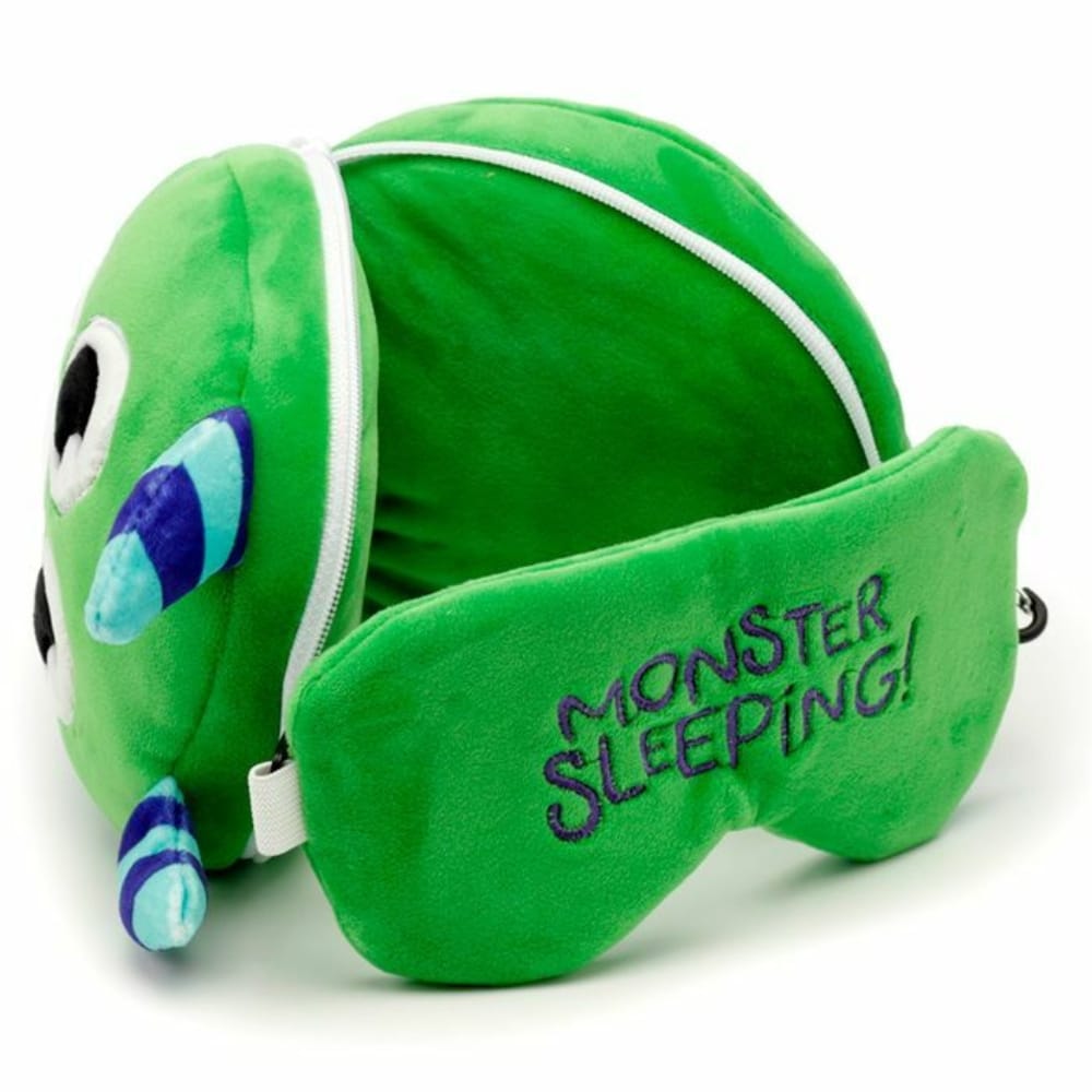 Relaxeazzz Matkapehmo monsteri on pehmolelu, jonka sisälle kätkeytyy kekseliäs matkatyynyn ja silmälappujen yhdistelmä.