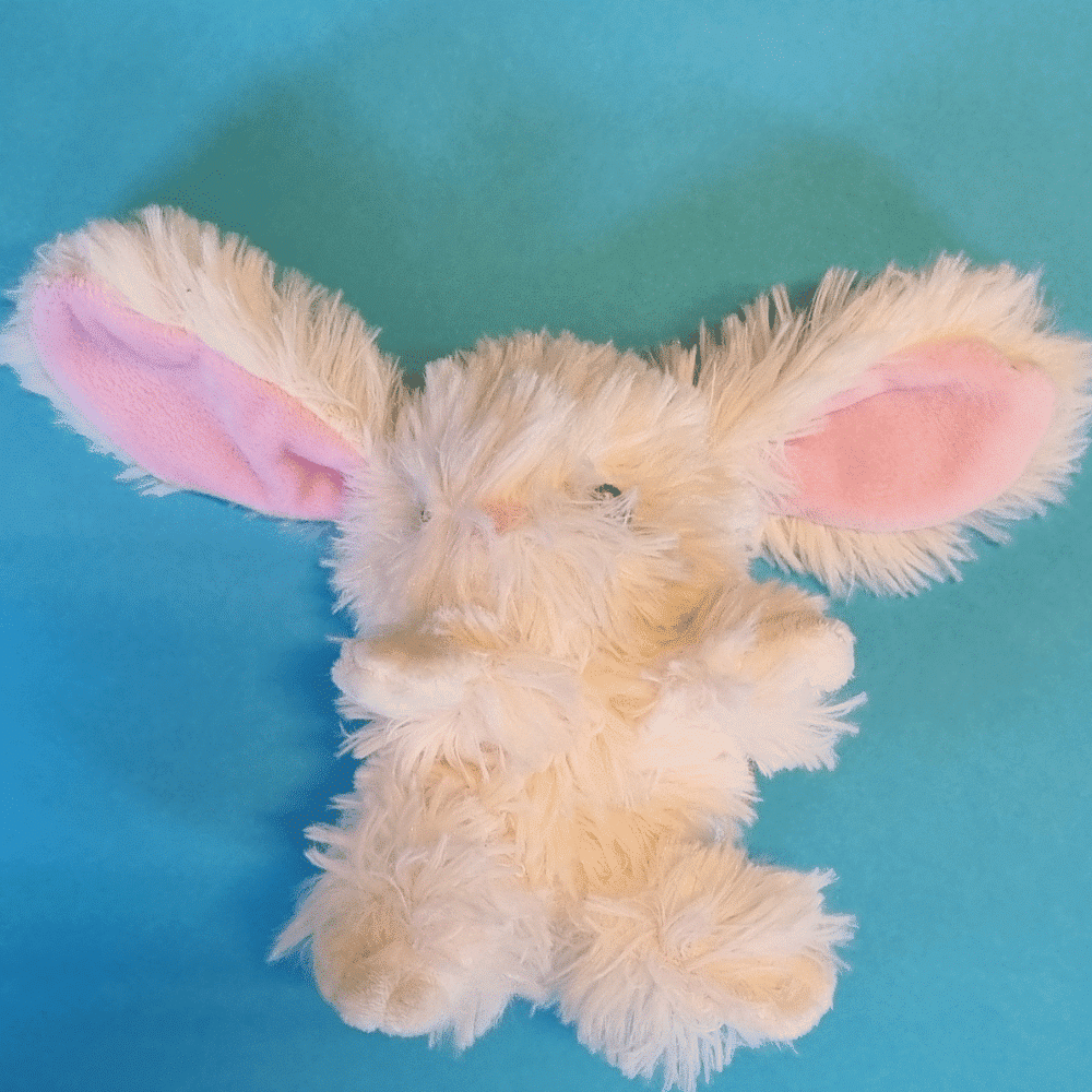 Pehmeä valkoinen mini pehmolelu pupu odottaa leikkihetkiä ja päiväunihetkiä.