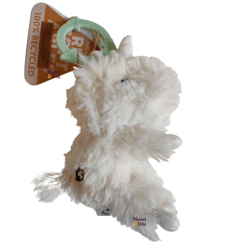 Suloinen valkoinen pieni yksisarvinen on tehty 100 %:sta kierrätysmateriaalista. Usko tai älä, kolmesta muovipullosta! Voit laittaa pehmon roikkumaan vaikka reppuusi kiinni kiinnikkeellä.