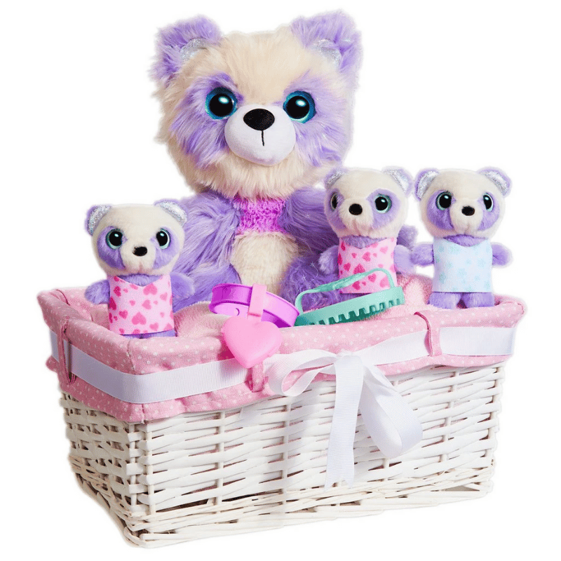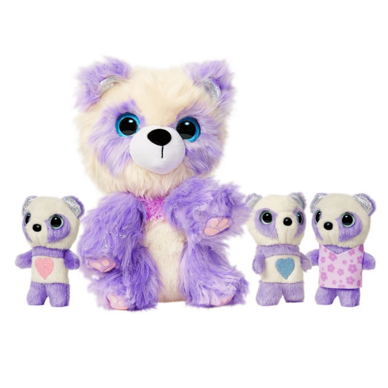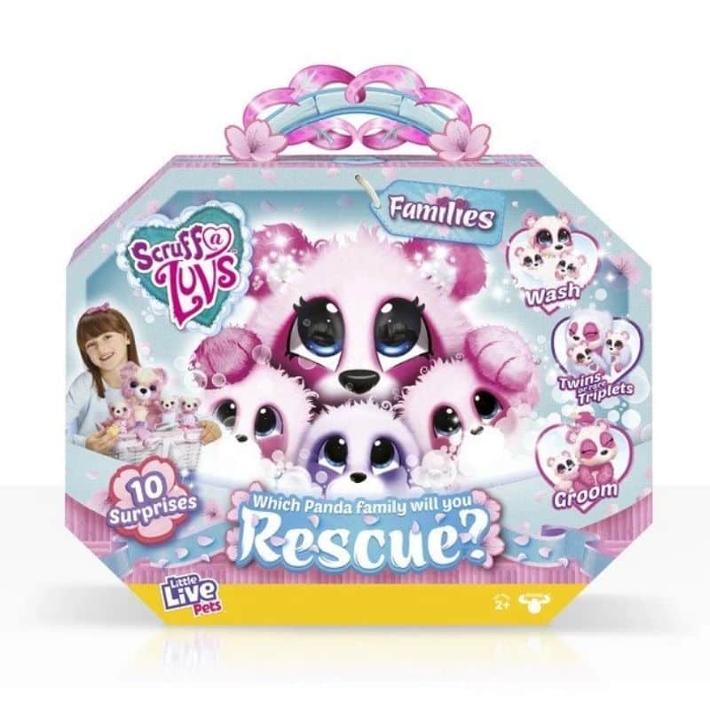 Hylätty, nuhjuinen Scruffaluvs-pandaperhe tarvitsee huolenpitoasi ja ansaittua kylpyä. Hoivaa eläinperhettä ja saat ne muuttumaan suloisiksi pehmolemmikeiksi. Poikasten määrä on yllätys, perheessä saattaa olla kaksoset tai kolmoset. Perheitä on kahtena eri värisenä, violettina tai vaaleanpunaisena. Yllätyspakkaus.