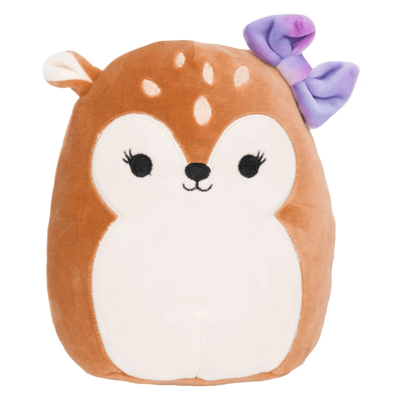 Tiktokista tuttu pehmoinen Squishmallows Dawn peura -pehmolelu! Dawnilla on pehmeä ruskea turkki, valkoisia yksityiskohtia, vaaleanpunainen rusetti ja aina pieni hymy kasvoillaan.