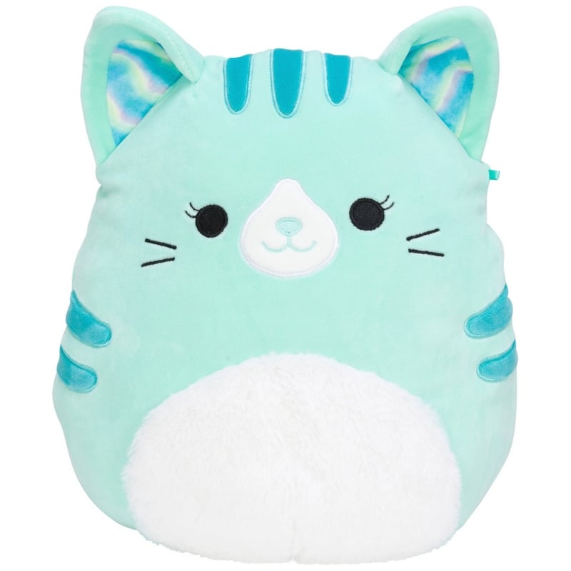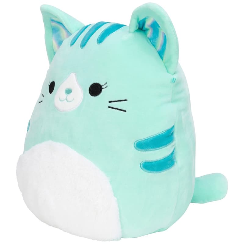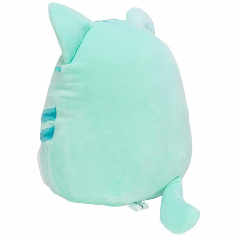 Lisää Corinna-kissa pehmolelu joukkoosi! Tämä 30 cm Squishmallow-pehmolelu on vaalean mintun värinen, jossa on tummempia raitoja ja sateenkaarikorvat.