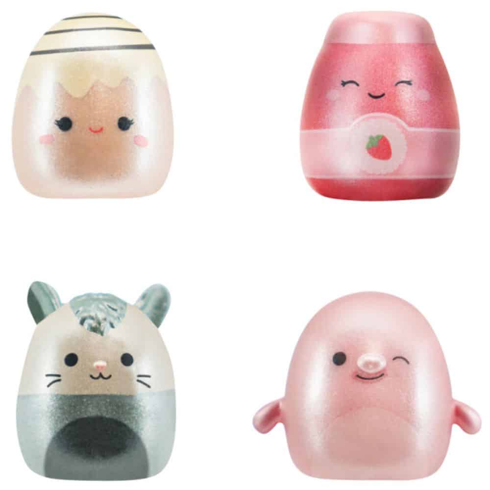 Pehmeästä muovista valmistetut Squish-a-longs 2,5 cm hahmot suloisessa avaimenperäkotelossa. Kotelossa mukana 3 hahmoa ja sormuskanta.