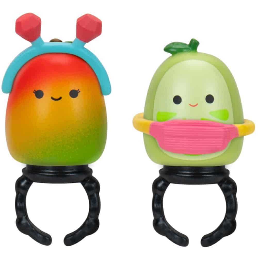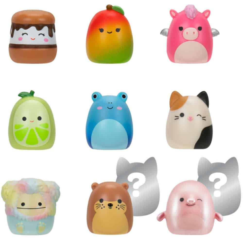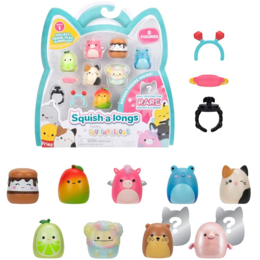 Squishmallowsit 2,5 cm kokoisina pehmeästä muovista valmistettuina Squish-a-longs hahmoina 8 kappaleen pakkauksessa. 1 hahmoista on piilossa. Lisäksi 2 tarviketta ja sormuskanta. Mukana myös keräilyopas.