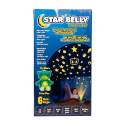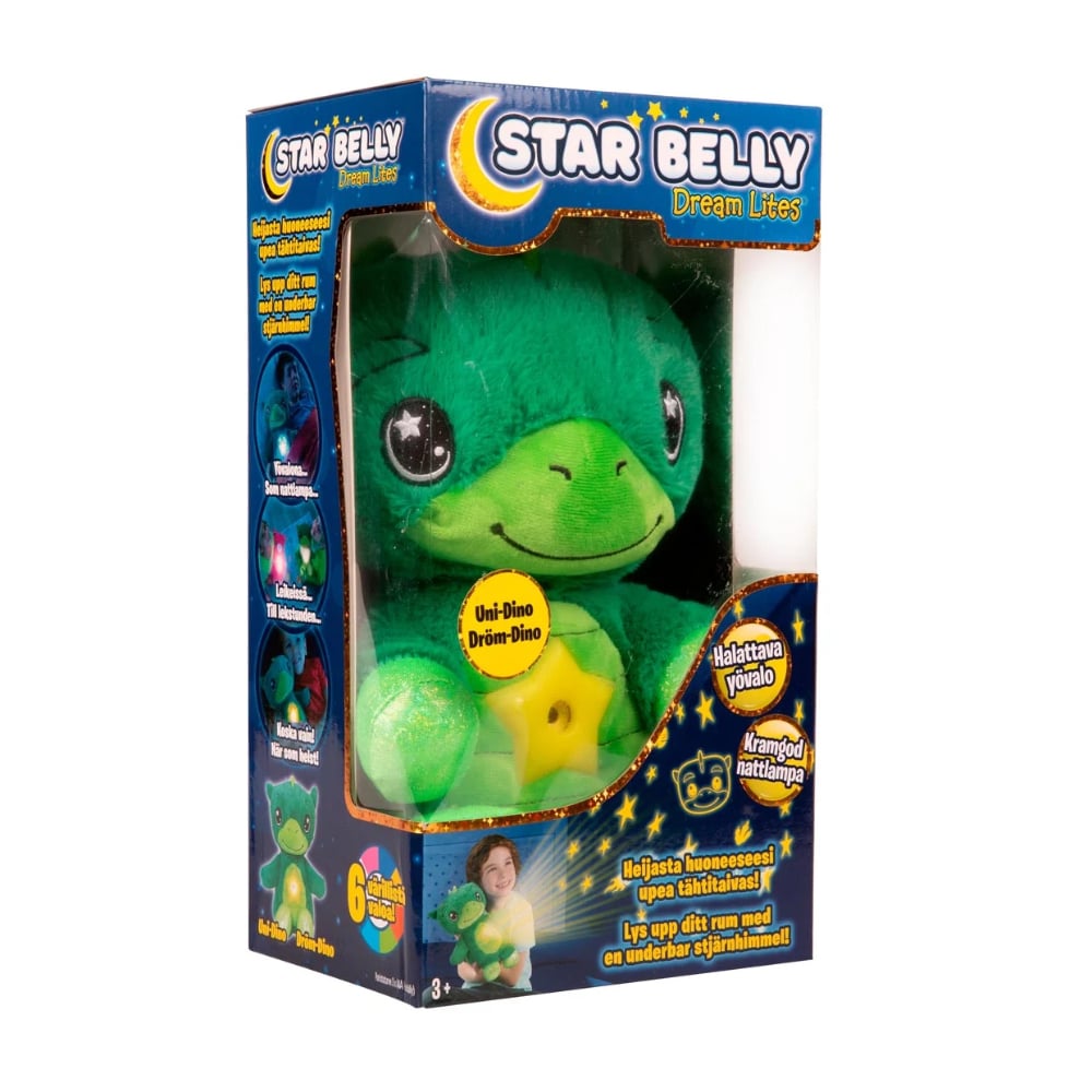 Star Belly dino yövalopehmolelu on samettisen suloinen pehmo, jossa on yövalo. Vihreän dinon vatsassa on tähti, joka heijastaa kattoon kauniin tähtitaivaan kuudella eri värillä. Yksisarvisella on lempeät silmät, joissa näkyy tähtiä sekä ihanat tassut. Tähtivalon saa pysymään joko paikoillaan tai pyörimään hitaasti. Yövalossa on uniajastin, joka sammuttaa tähdet automaattisesti 15 minuutin kuluttua. Paristotarve 3 x AAA, eivät sisälly pakkaukseen. Halittava yövalo sopii yli 3-vuotiaille ja sitä vanhemmille lapsille.
