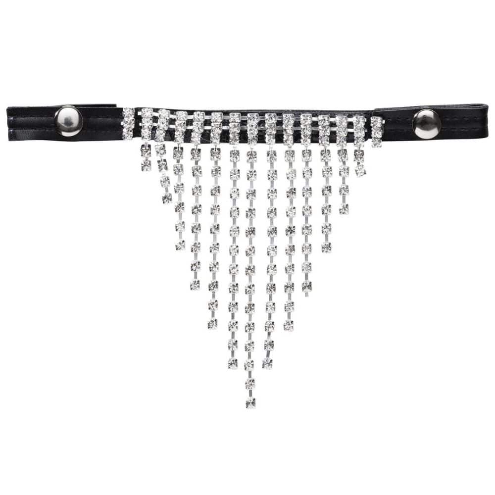 Upeasti kimaltava strassipanta keppihevoselle! Otsapannan pituus on 24 cm. Se on valmistettu keinonahasta ja kiinnitetään suitsien otsaremmiin metallinapeilla.