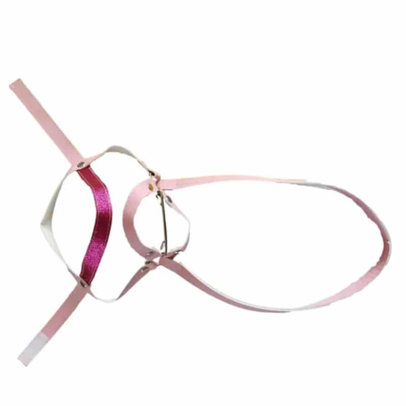 Kauniit vaaleanpunainen glitteröidyt kuolaimella varustetut keppihevosensuitset hauskoihin hevosleikkeihin! Kiinnitys toimii tarranauhalla ja suitset jäljittelee nahkaa.