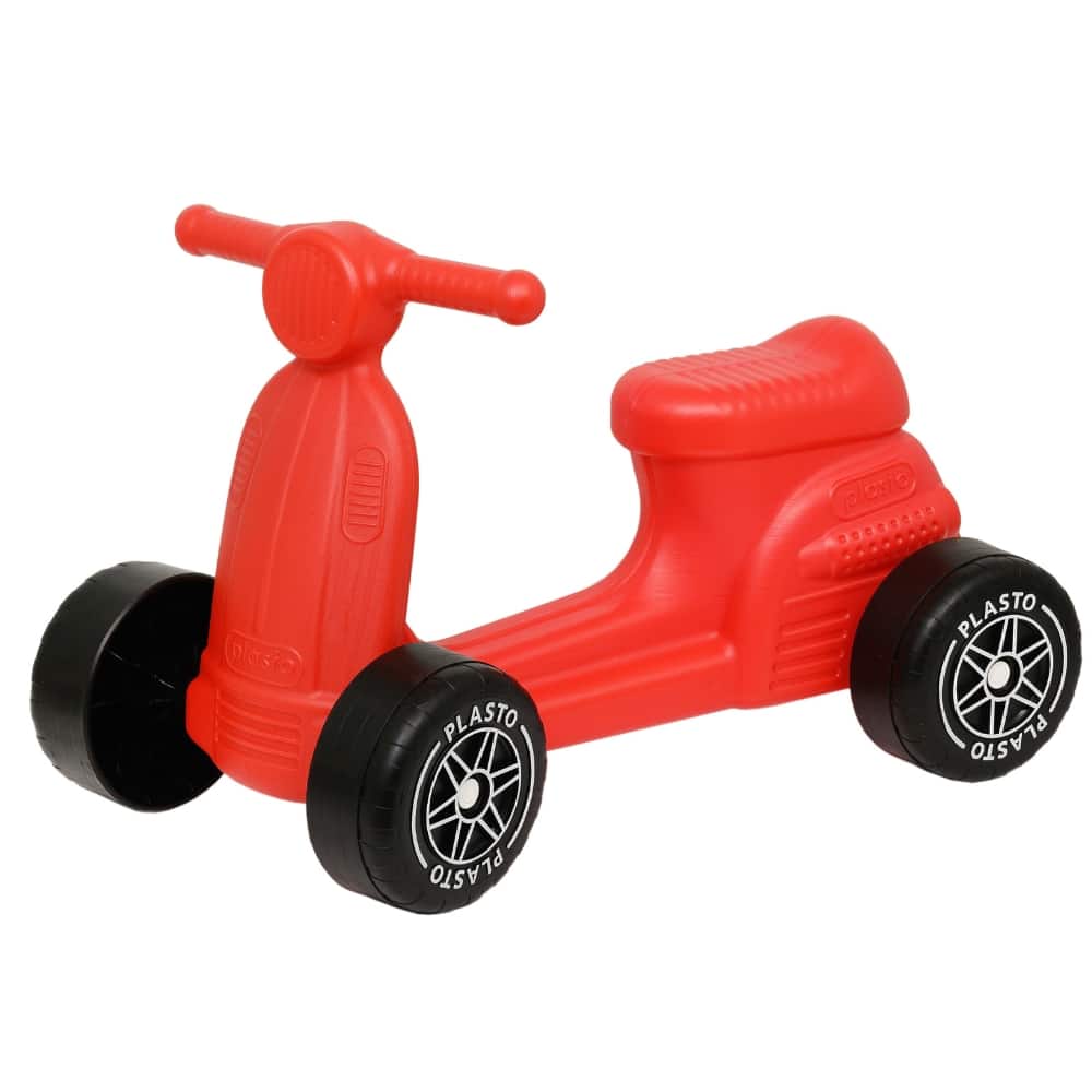 Plasto potkuskootteri punainen. Pirteässä Plaston skootterissa on hiljaiset renkaat! Lelun istumakorkeus on 22 cm ja se on valmistettu Suomessa materiaaleista muovi ja metalli.