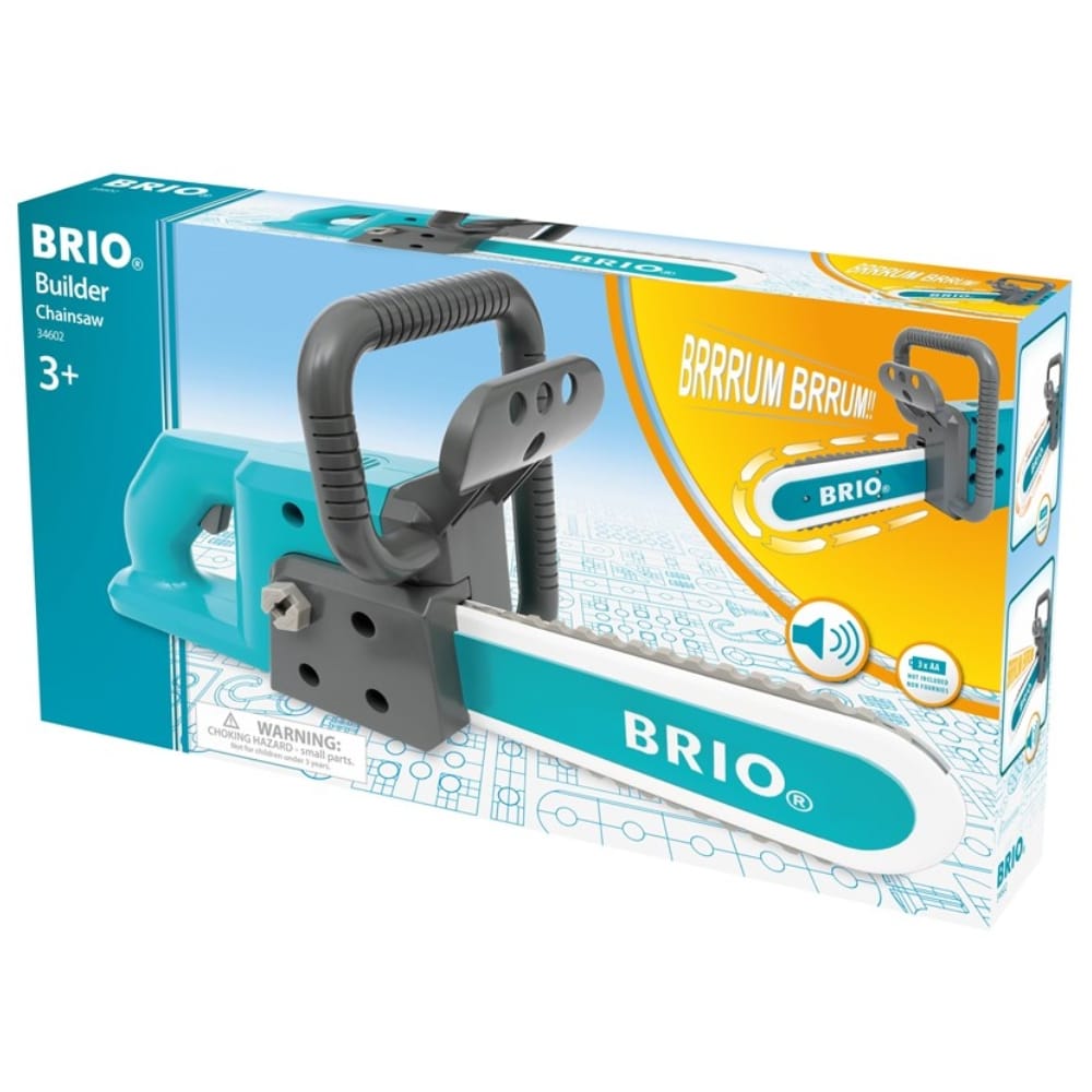 Brio Builder moottorisaha 34602. Bzz bzzzz, aloita puutyöt Brion moottorisahalla! Sini-valkoisessa moottorisahalelussa on realistisia ja turvallisia roolileikkitoimintoja, kuten pyörivä teräketju ja leikkisät sahausäänet.