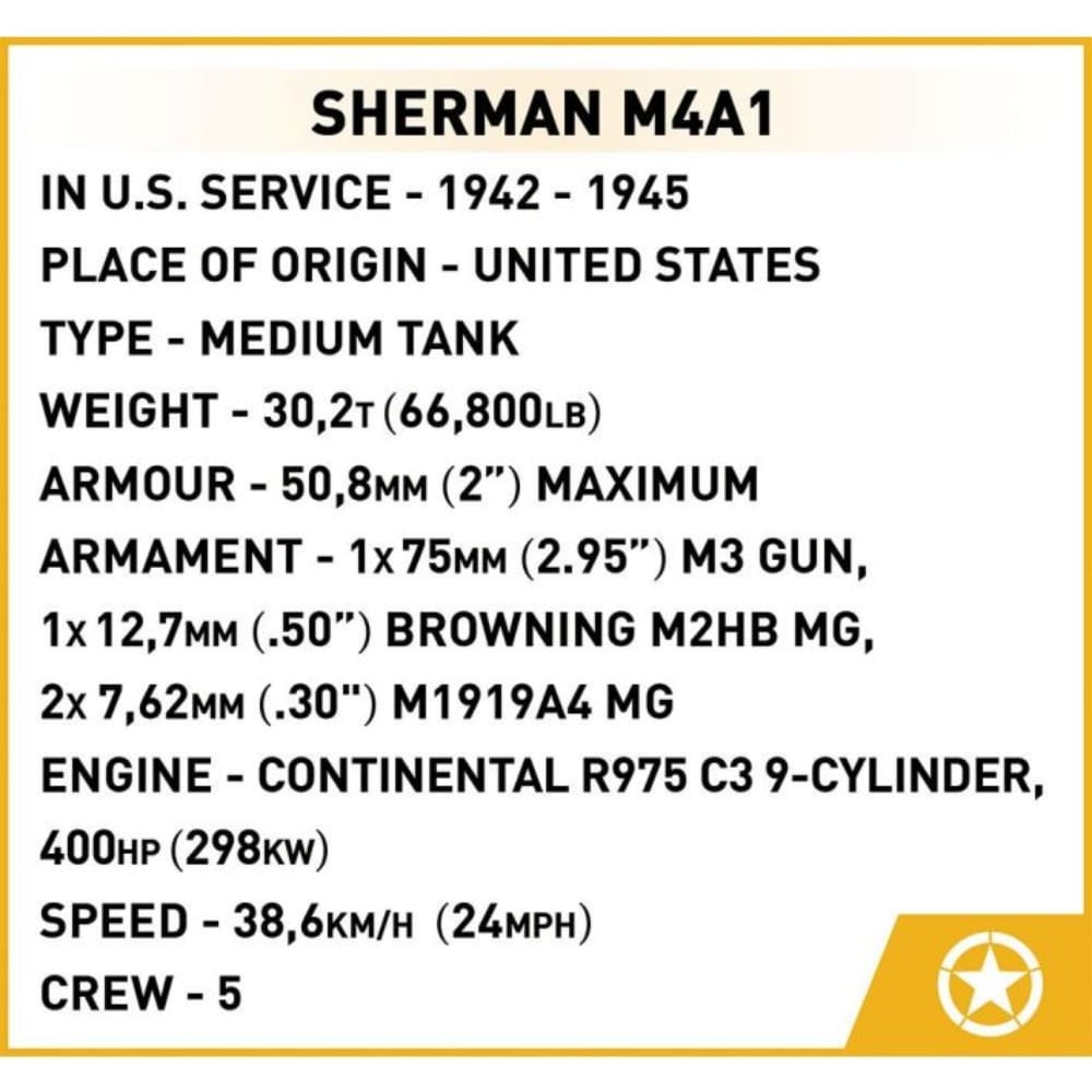 Rakennussarja Sherman on huolellisesti suunniteltu 1:35 mittakaavassa, siinä on 615 osaa. Säiliössä on työtelat, pyörivä torni, liikkuva piippu, avattava luukku ja huoltoluukku, jonka alla on moottori. Setti sisältää myös amerikkalaisen tankkerin hahmon kuulokkeineen ja M3-koneen ”rasvapistoolilla”. Paloissa on korkealaatuisia printtejä, joissa on tankin merkintöjä ja yksityiskohtia sekä panssaripäällikön univormun yksityiskohtia.