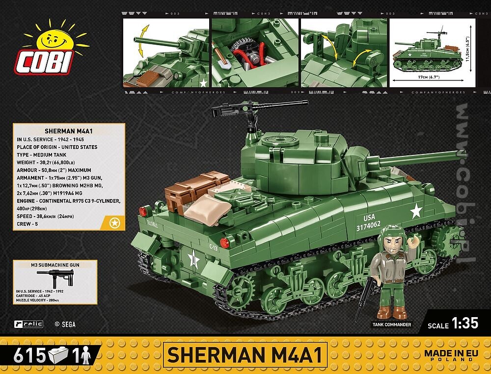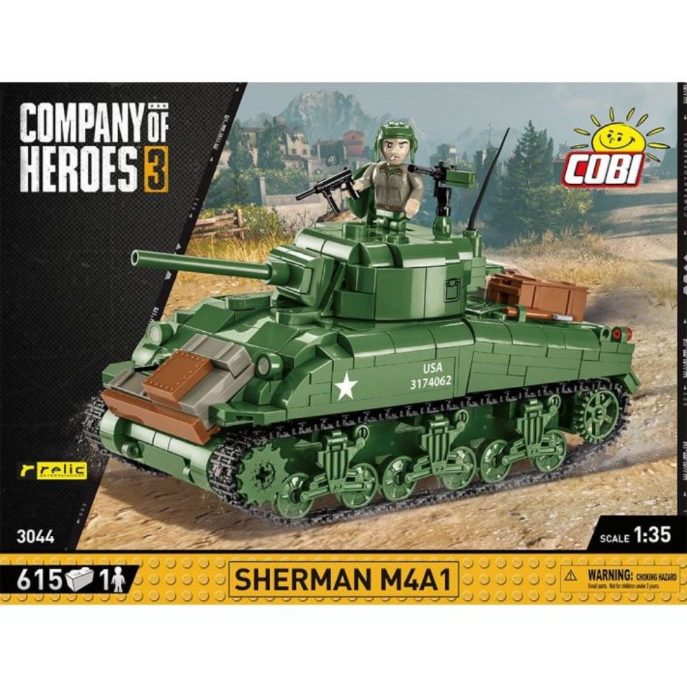 Cobi 3044 World War II tankki Sherman M4A1 – setti kehitettiin studiolla, joka loi sensaatiomaisen strategisen Company of Heroes 3 -pelin, joka sijoittuu toiseen maailmansotaan. Vie pelin tunnelma todelliseen maailmaan lisensoiduilla COBI-rakennussarjoilla.