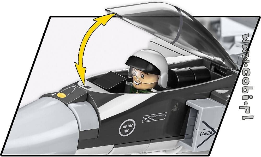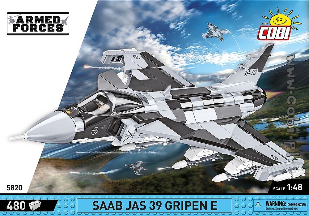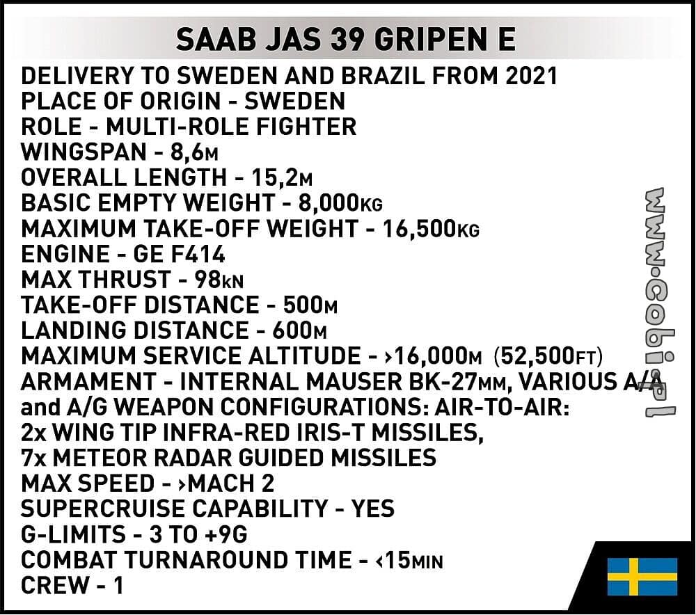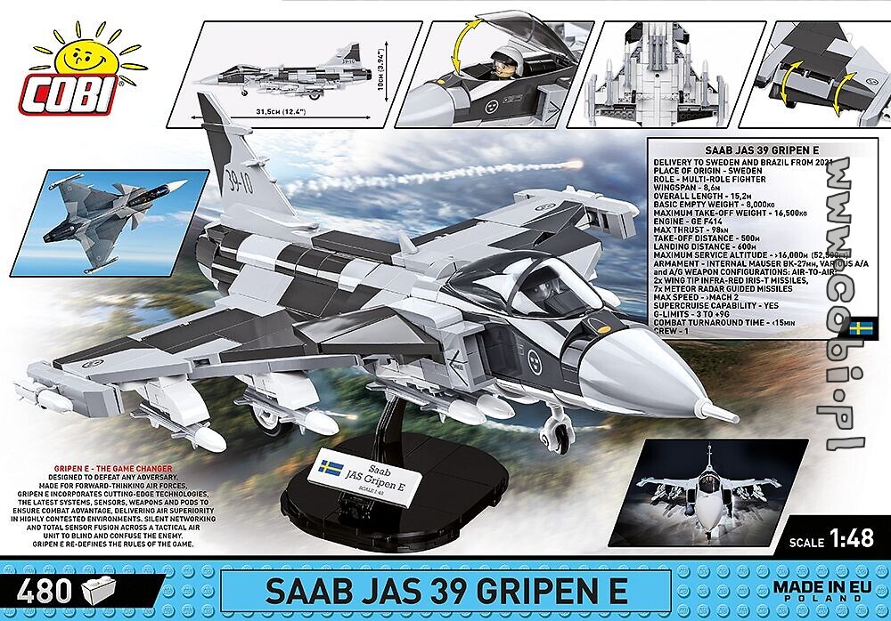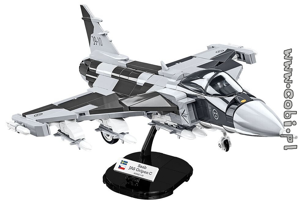 480 COBI-rakennuspalikalla rakennat nykyaikaisen, monikäyttöisen Cobi lentokone Saab Jas 39 Gripen E:n Ruotsin ilmavoimien väreissä, jotka on julkaistu SAAB-asekonsertin lisenssillä. Sarja on huolellisesti suunniteltu mittakaavassa 1:48. Lohkot on päällystetty korkealaatuisilla printeillä. Sarja sisältää erityisen lentäjärungon, joka voidaan sijoittaa avattavaan ohjaamoon. Koko setti täydentää esittelytelineen, jossa on setin nimi ja Ruotsin kansallislippu!