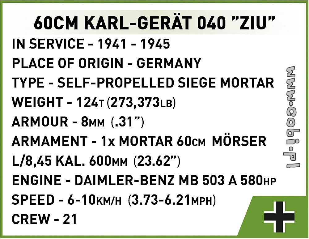 Karl-Gerät 040 oli raskain itseliikkuva kranaatinheitin, jota käytettiin toisen maailmansodan aikana. Se oli varustettu valtavalla 60 cm aseella. Saksalaiset pystyivät tuottamaan sodan aikana vain muutaman kappaleen. ”Ziu” Karl Gerätiä, numero 6, käytettiin ampumaan Varsovaa vuoden 1944 kansannousun aikana. COBI-rakennuspalikoista valmistetussa 60cm Karl-Gerat 040 ”Ziu” -mallissa on monia liikkuvia elementtejä, kuten pyörivät pyörät ja työtelineet, liikkuva aseenpiippu ja latausjärjestelmä. Uudessa versiossa on paranneltu muotoilu ja se sisältää vielä enemmän yksityiskohtia.