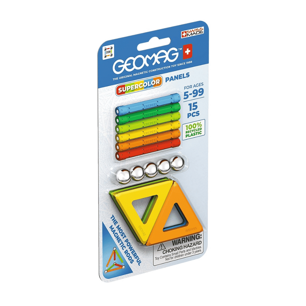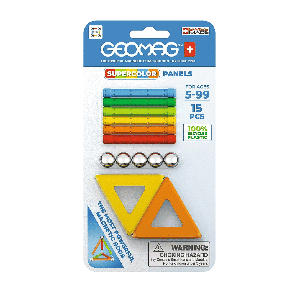 Tällä Geomag -rakennussarjalla voit rakentaa ohjeiden tai mielikuvituksesi mukaan 3D-rakenteita magneettitankojen, teräspallojen ja muovisten paneeleiden avulla.
