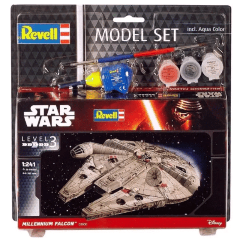 - Pakkaus sisältää: Revell Star Wars Set Millennium Falcon– pienoismallin, kolme maalia, kaksipuoleisen siveltimen ja Revell koottavan liiman.