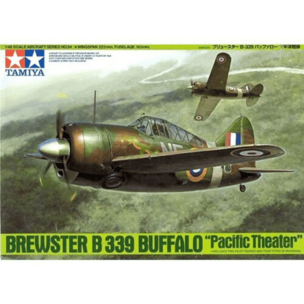 [ About the B-339 Buffalo ] At the beginning of the Pacific War, the B-339 was the main fighter of the Royal Air Force and the Dutch East Indies Air Corps in Southeast Asia, and fought fierce battles with the Japanese Zero and Hayabusa. 339 Buffalo. The B-339 is an export version of the U.S. Navy’s carrier-based fighter F2A-2, and the B-339E for the UK was equipped with additional bulletproof glass and bulletproof plates, as well as a Mk. The B-339 B-339 Buffalo is a plastic model assembly kit. ●1/48 scale, total length 163mm, overall width 223mm.★Realistic reproduction of unique style such as strong torso and unique main landing gear.★Specifications for Royal Air Force, Dutch East Indies Air Corps, and US Navy are available. ★The cockpit, canopy, fuselage tail, propeller, and other parts of each country’s specifications have been modeled.★Two 100-pound bombs are included as weapon parts.Two pilot figures in a seated and standing pose, with 4 markings. With kin