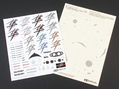 1/12 scale, Overall length: 178mm, Overall width: 71mm. From its unique shape to the engine, this model accurately reproduces the real Hayabusa. Parts such as upper cowling and tank are molded as one piece. For engine, cowling, and swing arms screws are used for reliable attachment to the frame. Metallic stickers are used to increase realism of the front fork. Tires are made of real rubber.