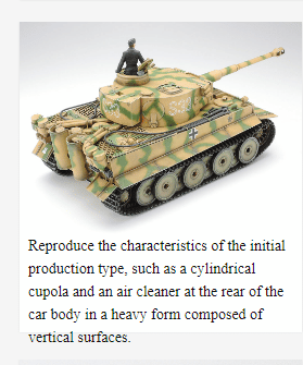 [A model that conveys the solid response of the strongest tank] The Tiger I early type appeared at the end of the war in 1942, on the Eastern Front, and on the North African Front, giving a shock to Allied soldiers. While inheriting the traditional style of German tanks with vertical planes, it was the most powerful heavy tank at the time of its appearance due to its powerful 88mm gun and heavy armor of up to 100mm. The initial type features a heavy style such as a large cylindrical cupola for the commander, a turret with a smoke grenade launcher and a large pistol port, and an air cleaner at the rear of the hull. About 200 vehicles were produced by June 1943. [About the model] This is a 1/35 scale plastic model assembly kit. ★Length: 241.5mm, Width: 106mm. ★Tiger Type I Modeled from the early model, which is said to have the most solid style among all types. ★Details of the early model, such as the simple cylindrical cupola, smoke grenade launcher, turret with large pistol port, and air cleaner at the rear of the hull, are accurately reproduced. ★Set includes 2 types of air cleaner, sbrocket wheels, and mantlet. ★The air cleaner hose is recreated with a pineal pipe with a realistic mesh pattern. ★Easy-to-assemble belt-type crawler tracks with a pattern unique to the early model. ★Set of 6 types of slide marks, such as Lieutenant Wittmann’s vehicle, including those on the Eastern Front and those on the Tunisian Front. ★Comes with a tank commander figure.